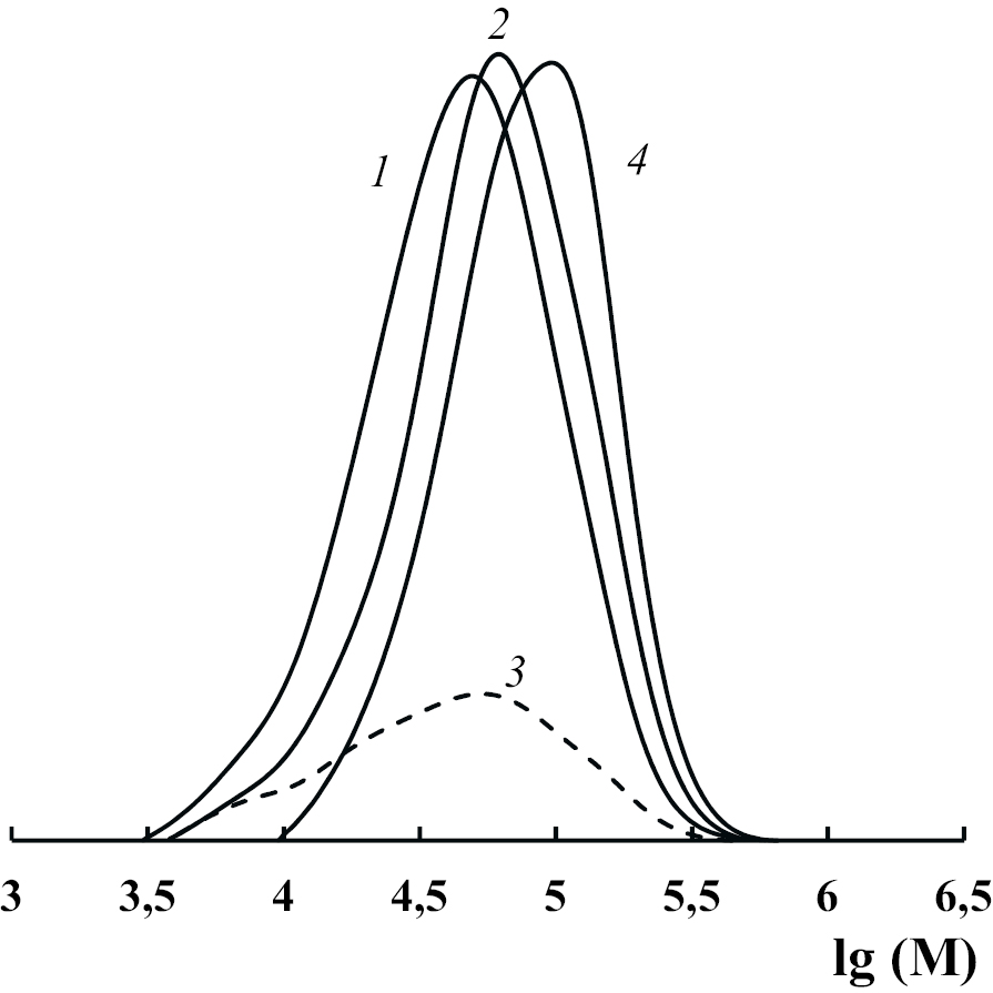 Рис. 6. Кривые ММР полиметилметакрилата (1) и продуктов его блок-сополимеризации с БЗМА (2–3; табл. 2, образец 6) и постполимеризации (4; табл. 2, образец 4). Детекторы: 1, 2, 4 – рефрактометр, 3 – УФ-детектор