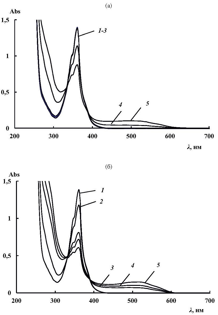 Рис. 8. Спектры поглощения растворов феназина в ДМСО. Облучение светом с λмакс ~ 365 нм; концентрация феназина в ДМСО 0.017 мг/мл; мольное соотношение феназин : t-BuBr : Bu3N = 1 : 100 : 50. 1 – до облучения; 2, 3 – после облучения в присутствии t-BuBr (а) и Bu3N (б) в течение 10 (2) и 30 мин (3); 4, 5 – после добавления Bu3N (а) и t-BuBr (б) и облучения в течение 10 мин (4)