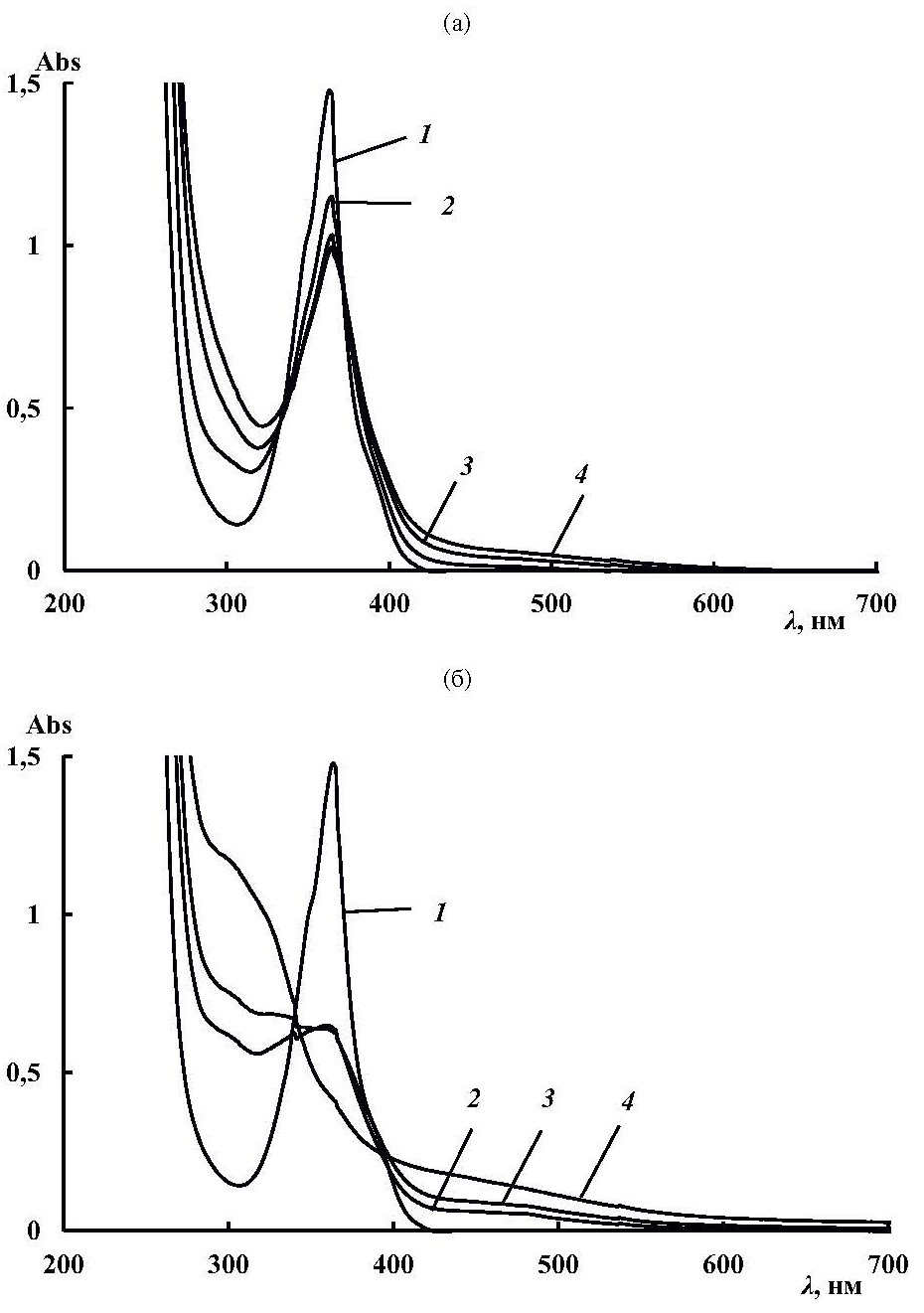 Установлено, что при облучении раствора феназина в присутствии t-BuBr в этилацетате в течение 0.5 ч изменения интенсивности полосы поглощения с λ ~365 нм не наблюдалось (рис. 7а, кривые 1–3). Однако введение Bu3N в раствор и дальнейшее облучение приводит к изменению вида спектра: снижению интенсивности полосы поглощения λ ~365 нм, а также появлению полосы в области 280–300 нм и широкого плеча 450–520 нм (рис. 7а, кривые 3–4).