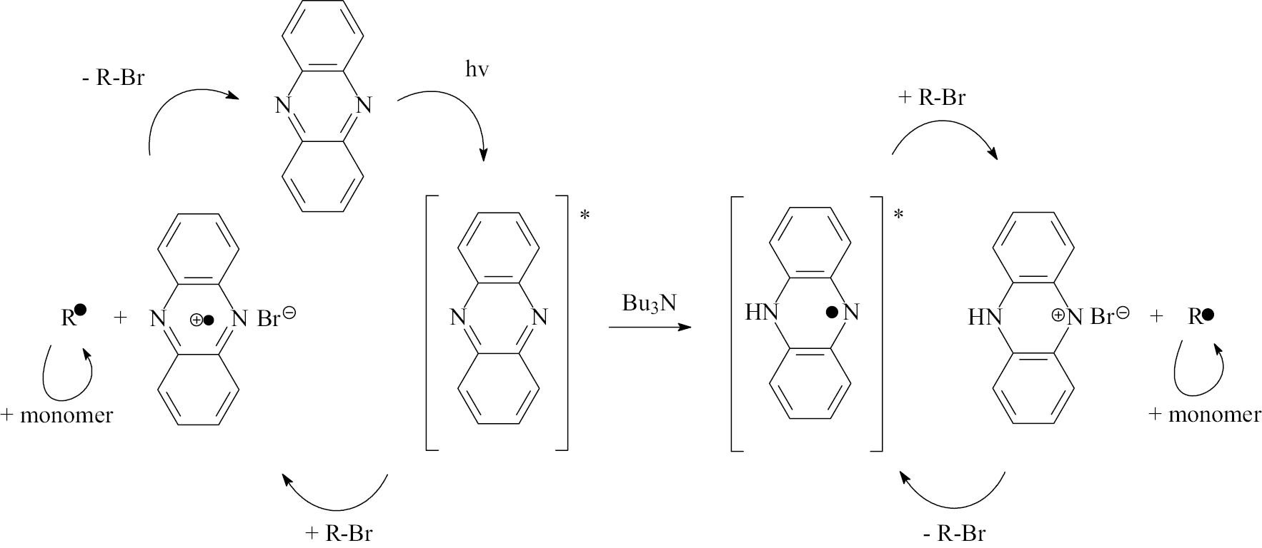 Схему процесса фотополимеризации с участием феназина можно представить в следующем образом. Генерирование углеродцентрированных радикалов, инициирующих полимеризацию, в случае применения феназина в сочетании только с броморганическими соединениями происходит по окислительной схеме o-ATRP (аналогично схеме (1)). При поглощении кванта света имеет место переход феназина в возбужденное состояние с последующей отрывом атома галогена и образованием пары катион-радикал феназина + анион брома, и углеродцентрированного инициирующего (или полимерного) радикала.