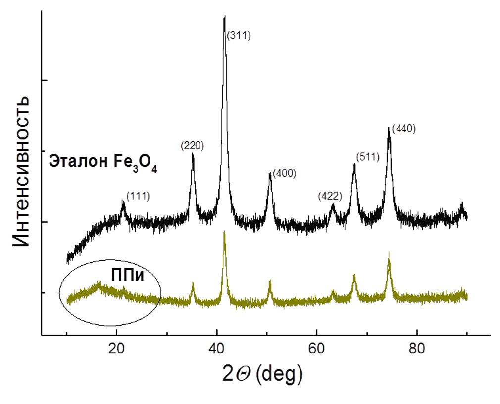 Среди оксидов железа магнетит обладает наиболее выраженными магнитными свойствами, биосовместим и отличается высокой стабильностью. По этой причине планировалось получить именно такой тип смешанного окисла железа [39, 45]. Экспериментальным подтверждением образования магнетита служат данные рентгенофазового анализа. Рентгенограмма Т-ППи-Fe3O4 содержит набор пиков, которые полностью совпадают с пиками эталона магнетита, а в малоугловой области дифрактограммы присутствует аморфное галло, характерное для полипиррола (рис. 4).