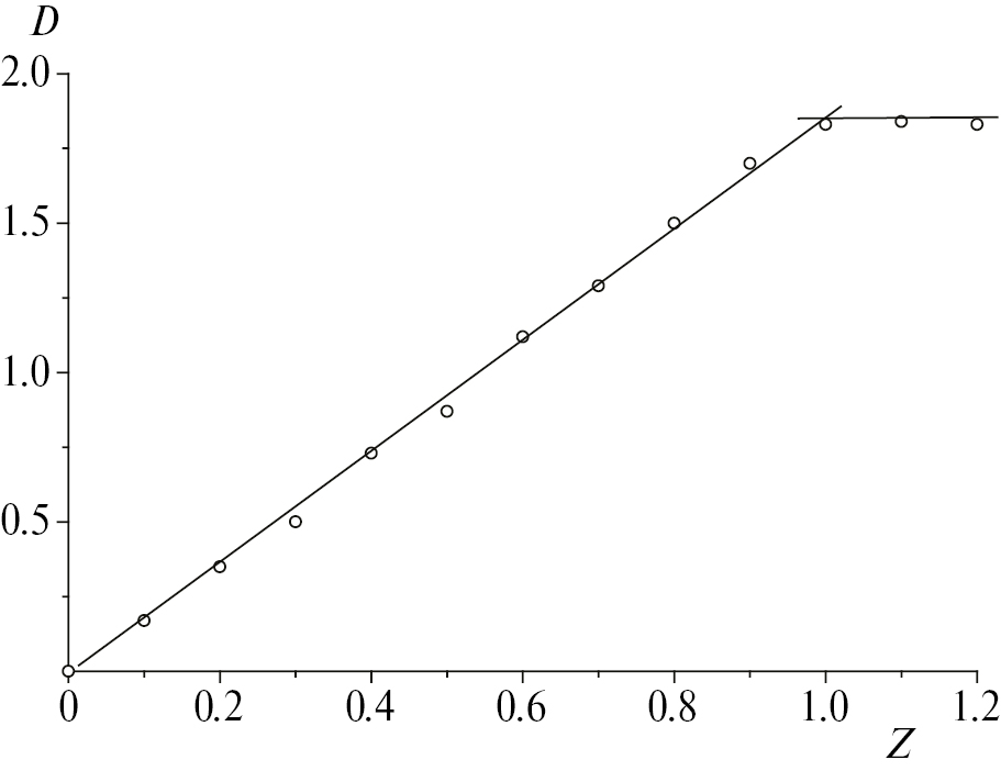 В процессе работы было обнаружено, что при титровании водного раствора ПАК раствором разветвленного ПЭИ со степенями полимеризации 3.33 × 103, 1.93 × 102 и рН 3.6, 10.5 соответственно добавление незначительного количества разветвленного ПЭИ приводит к появлению опалесценции раствора. Зависимость оптической плотности раствора смеси от мольного соотношения функциональных групп полиэлектролитов: Z = [N] / [COOH], где [N] для разветвленного ПЭИ равно сумме концентрации первичных, вторичных и третичных аминных групп показана на рис. 1.