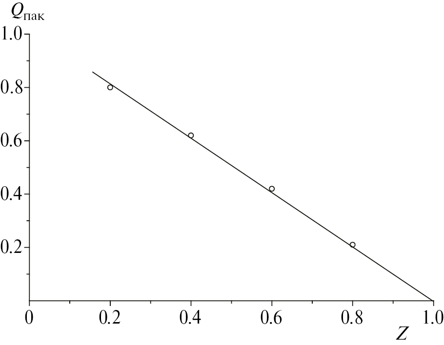 На рис. 2 представлена зависимость доли ПАК, остающейся в супернатанте QПАК от состава смеси Z. Полученная зависимость линейна, что свидетельствует о накоплении в осадке комплекса постоянного состава.