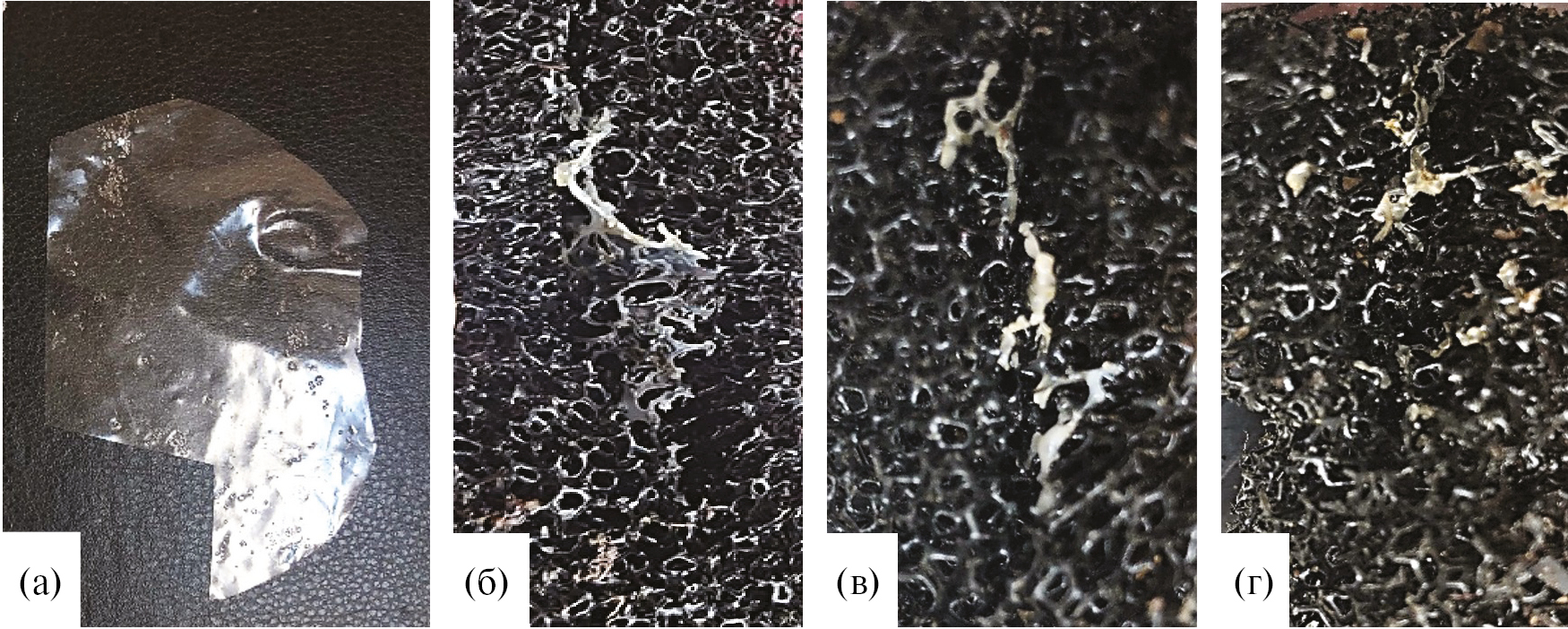 Таким образом, в процессе компостирования на протяжении всего эксперимента ППК находился во влажной среде при температуре выше температуры стеклования в атмосфере реакционно-активных газообразных продуктов, образующихся при разложении пищевых отходов, а также в присутствии активно развивающегося разнообразного микробного сообщества. Все эти факторы могут влиять на процесс деструкции полимера. На рис. 6 представлены фотографии образца ППК до и после компостирования в течение разного времени.
