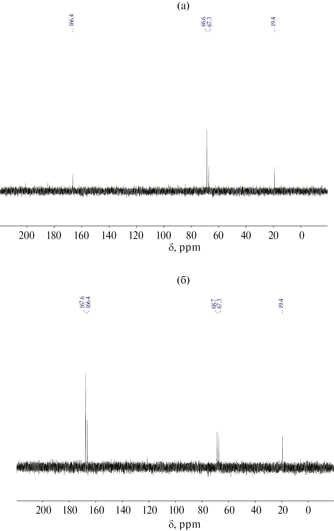 Поскольку при деструкции ППК образуется пропиленгликоль, естественно, что при этом должен выделяться и СО2. В условиях эксперимента можно ожидать образования продуктов взаимодействия водного раствора NH3 и CO2, например карбоната, гидрокарбоната или карбамата аммония, а также мочевины. Анализ спектра ЯМР 13С продукта нагревания ППК при 70 °С в аммиачном растворе в D2O показал наличие сигналов в области 166.4, 68.6, 67.3 и 19.4 м.д. (рис. 12а). Для упрощения идентификации вещества к данному раствору был добавлен карбонат аммония, что привело к появлению в спектре дополнительного сигнала при 167.6 м.д. (рис. 12б). Следует заметить, что ионы гидрокарбоната и карбоната неотличимы в ЯМР из-за быстрого обмена протонами (в шкале времени ЯМР) [37]. Их точная идентификация по химическим сдвигам в спектрах ЯМР в водных растворах затруднена, так как химические сдвиги соединений могут заметно изменятся при варьировании температуры, ионной силы раствора или pH. Однако можно различить химические сдвиги гидрокарбоната и карбамата аммония, поскольку сигнал карбонильной группы карбамата аммония в спектре ЯМР 13С будет смещен в область сильного поля относительно сигнала карбонильной группы гидрокарбоната. Следовательно, спектр ЯМР, приведенный на рис. 12а, вероятнее всего, соответствует карбамату аммония, а добавление к нему карбоната аммония привело к появлению второго сигнала от карбонатного иона (рис. 12б) [38]. Отсутствие мочевины в продукте деструкции было доказано аналогичным образом, путем добавления к исследуемому раствору мочевины и сравнению сигналов в полученных спектрах.