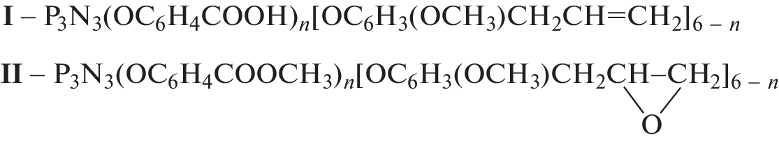 Для отверждения эпоксидной смолы марки “ЭД-20” или фосфазенсодержащего эпоксидного олигомера использован карбоксилсодержащий арилоксициклотрифосфазен (I). В случае ЭД-20 отверждение происходит в интервале 125–220°С и сопровождается экзотермическим эффектом, возрастающим от 26 до 50 Дж/г при увеличении количества арилоксициклотрифосфазена (I) от 25 до 50%. Отверждение фосфазенсодержащего эпоксидного олигомера возникает в температурном интервале 140–240°С и сопровождается эндотермическим эффектом (–ΔН = 6.5–6.8 Дж/г). Отвержденные композиции на основе ЭД-20 + I являются самозатухающими (класс горючести V-1 по UL-94), а композиции фосфазенсодержащего эпоксидного олигомера + I – негорючими (класс V-0 по UL-94) независимо от соотношения исходных компонентов.