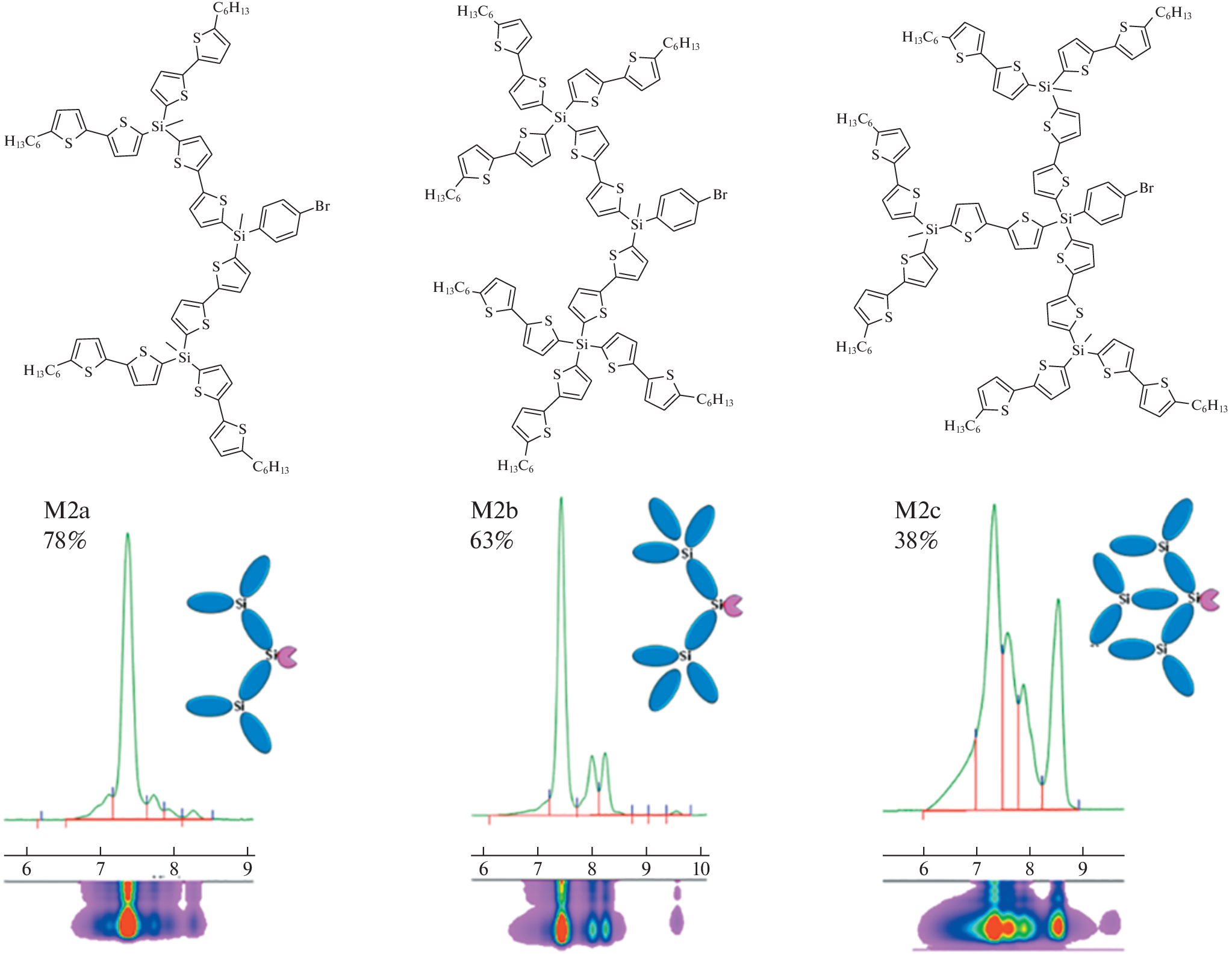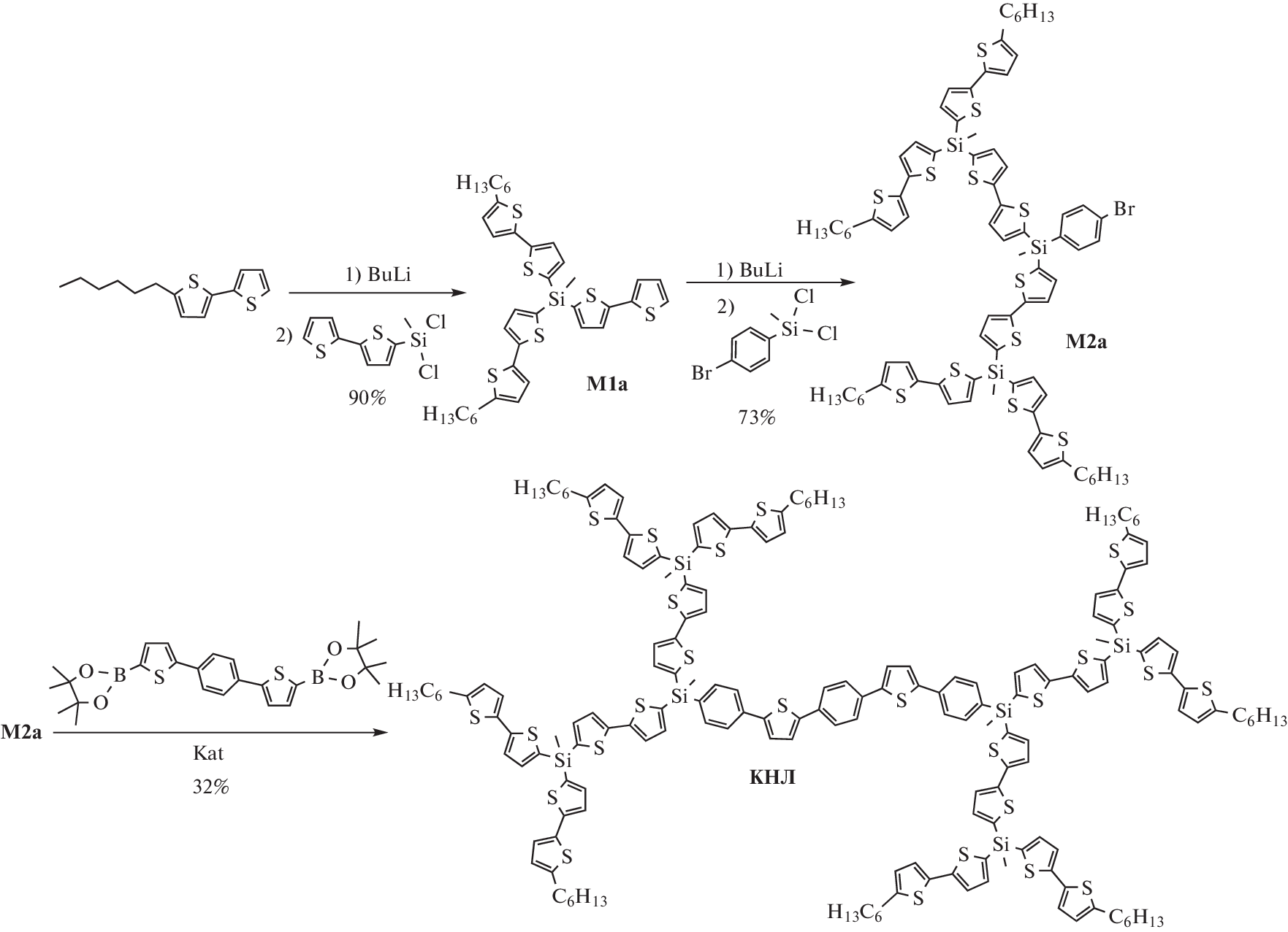 A synthetic scheme allowing the preparation of nanostructured organosilicon luminophores of branched or dendritic structure with up to 18 bithiophenesilane donor fragments and one central acceptor fragment has been elaborated. This universal scheme has been successfully upscaled to 20 g of the product, and its efficiency has been verified by the synthesis of two earlier unknown bithiophenesilane dendrimers with dense molecular shell and the central acceptor fragment, 1,4-bis(5-phenylthienyl-2-yl)benzene. The synthesis of more branched dendrimers under the Suzuki reaction conditions has led to the formation of the side products with the rupture of the Si–C(thiophene) bond, not typical of the synthesis of analogous compounds with lower branching degree under the same conditions.