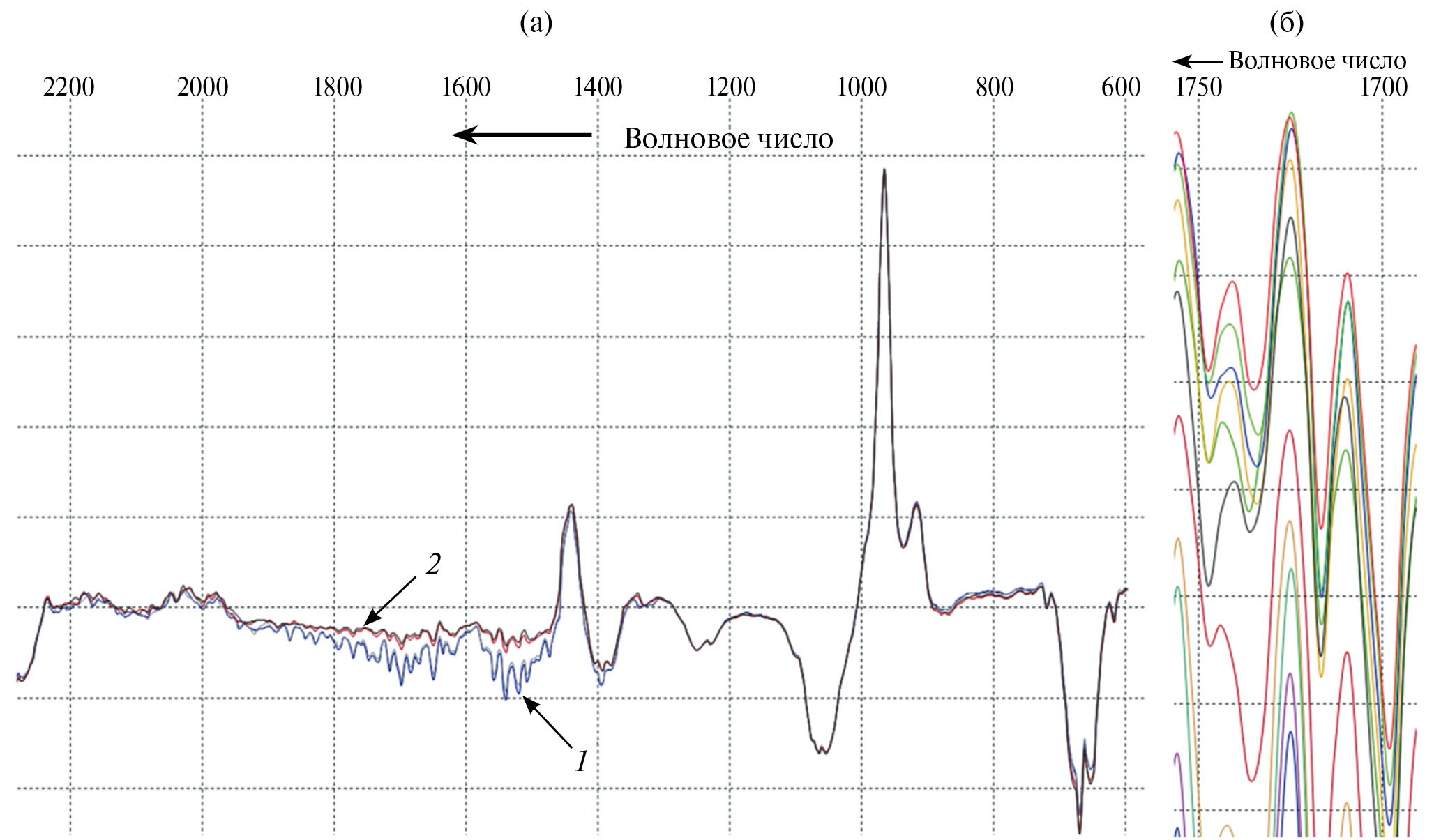 Рис. 1. Участок ИК-спектра пленки каучука БНКС- 28 АМН до старения (1) и после термоокислительного старения на воздухе (2) (а), а также динамика изменения интенсивности полосы поглощения 1722 см–1 (б). Цветные рисунки можно посмотреть в электронной версии.