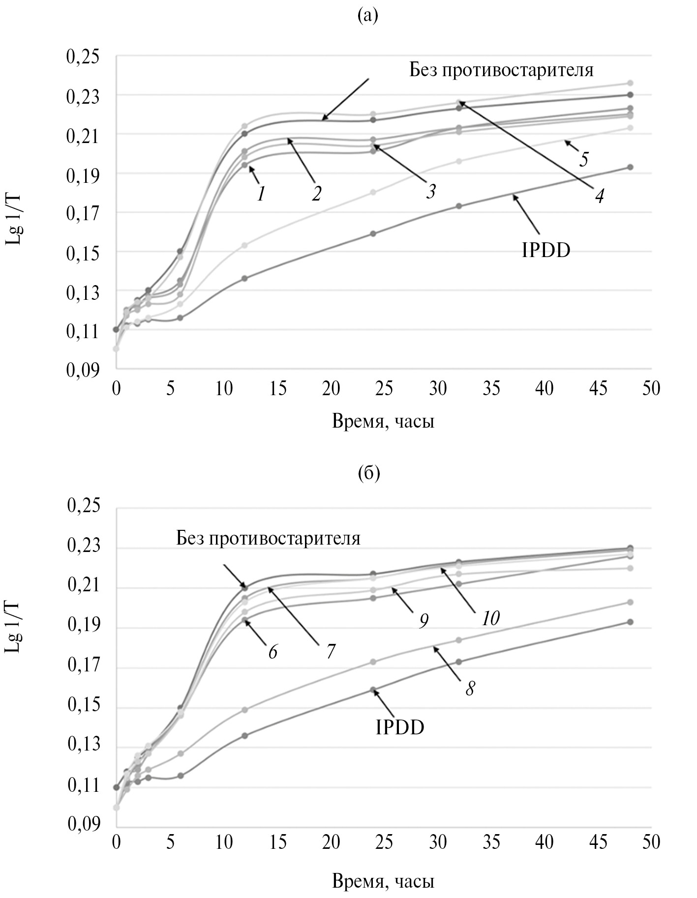 Рис. 2. Изменение интенсивности полосы поглощения 1722 см–1 (–С=O) в зависимости от времени термоокислительного старения (100 °C) для образцов, содержащих соединения 1–5 и 6–10 в сравнении с каучуком без противостарителя и содержащим IPDD.
