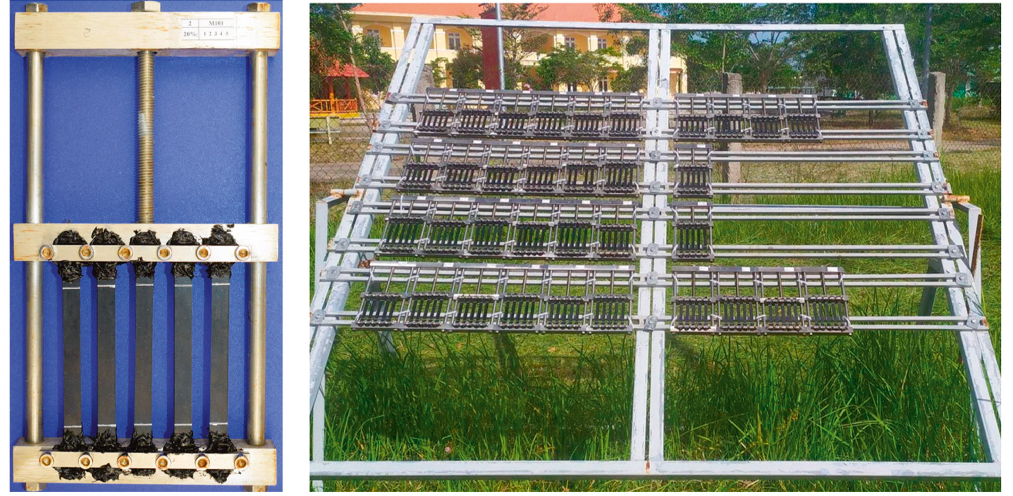 Натурные испытания образцов резин на территории испытательной станции Кон Зо ( Хошимин, Вьетнам) проводили на растянутых с помощью струбцин образцах в виде полосок, вырубленных вдоль направления каландрового эффекта размером 10 × 120 мм. Стандартные пластины 120 × 140 мм и шайбы диаметром 60 мм и толщиной 8 мм подвергали экспозиции в недеформированном состоянии. Образцы размещали на открытой площадке с травяным покрытием на стендах, ориентированных под углом 45°