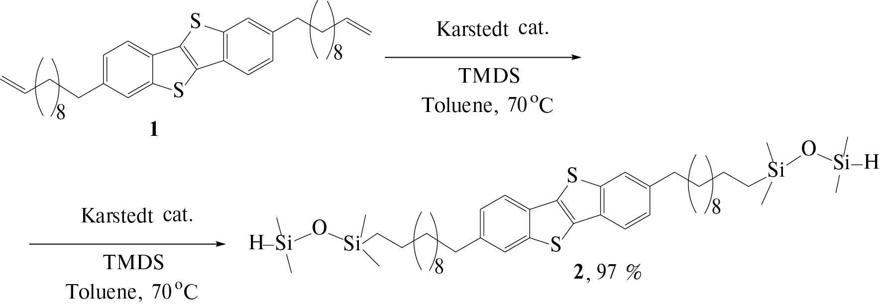 Синтез мономера 2 (2,7-бис-(11-(1,1,3,3-тетраметилдисилоксан)-ундецен)-[1]бензотиено[3, 2-b][1]бензотиофена) осуществлен по реакции гидросилилирования мономера 1 в присутствии катализатора Карстедта: