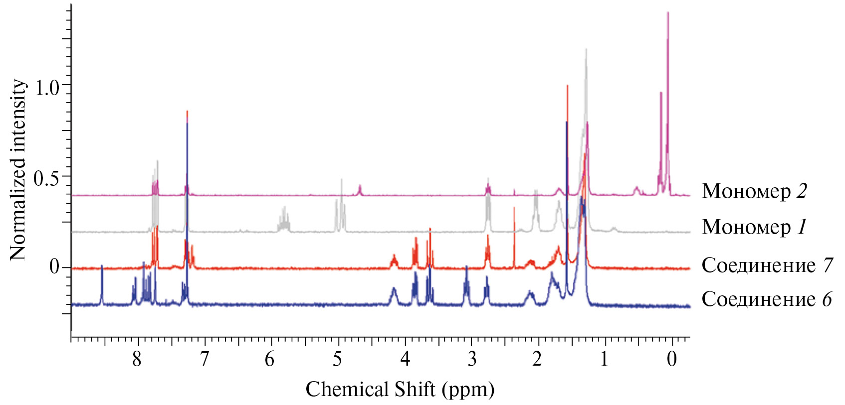 Рис. 1. Спектры ЯМР 1H сравнения полученных соединений 6, 7 и мономеров 1, 2. Цветные рисунки можно посмотреть в электронной версии.