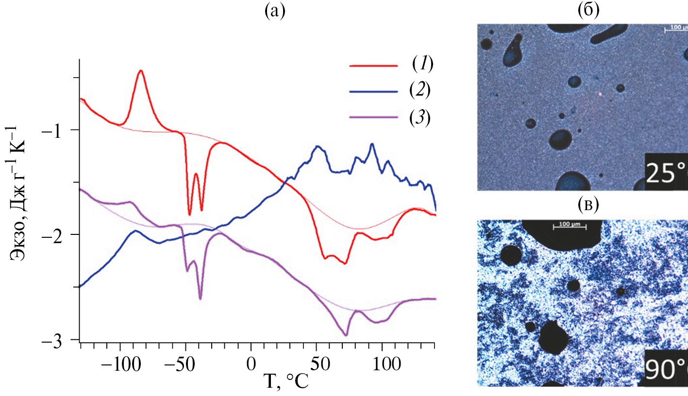 Рис. 5. Характеристики полимера [Si‒O‒Si‒С11-BTBT-С11]n: (а) ‒ термограммы ДСК нагревания (1), охлаждения (2) и повторного нагревания (3); (б), (в) ‒ микрофотографии в скрещенных поляроидах при 25° и 90°С соответственно.