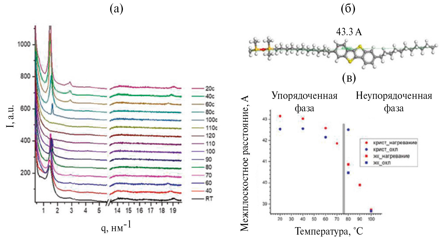 Изучение структуры и фазового поведения полимера [Si‒O‒Si‒С11-BTBT-С11]n также было проведено методом мало- и широкоуглового рентгеновского рассеяния при разных значениях температуры. При комнатной температуре на кривых рассеяния образца наблюдается интенсивный малоугловой рефлекс и несколько слабовыраженных максимумов в большеугловой области (рис. 6а). Межплоскостное расстояние, соответствующее малоугловому рефлексу, соста вляет 43.1 Å, что близко к выпрямленной конформации мономерного звена (рис. 6б) и свидетельствует о структуре смектического упорядочения типа E без наклона оси молекулы относительно нормали слоя [28, 29]. Вместе с тем, присутствие максимума в большеугловой области ~19 нм‒1 свидетельствует об упорядоченной упаковке фрагментов BTBT. Видимый рефлекс 120 соответствует пику кристаллической решетки BTBT, что свидетельствует о значительной роли упаковки жестких бензотиофеновых фрагментов в структурировании материала [30]. Параметры смектической и кристаллической субфаз BTBT и их фазовое поведение близко к структуре димеров с фрагментами BTBT [23] и гребнеобразных полимерных аналогов полидиметилсилоксана [31] исследованных ранее.