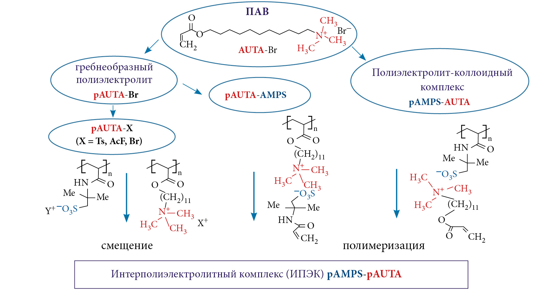 Особый интерес представляет случай интерполиэлектролитного комплекса, образованного полимерами сложной архитектуры. Подходящим примером таких полиэлектролитов могут служить полимерные ионные ПАВ. Под этим термином заложена целая серия полимерных объектов [16]. В настоящей публикации под полимерными ПАВ мы понимаем гребнеобразные полиэлектролиты, получающиеся полимеризацией поверхностно-активных мономеров с полимеризуемой группой в гидрофобном хвосте [17, 18]. Для создания интерполиэлектролитных комплексов из таких полимеров можно использовать как минимум три синтетических подхода формально приводящих к ИПЭК одного и того же брутто-состава. Ниже показана схема синтеза интерполиэлектролитных комплексов на основе поверхностно-активного мономера 11-акрилоилоксиундецилтриметиламмоний бромида (AUTA-Br) [19] (схема 1):