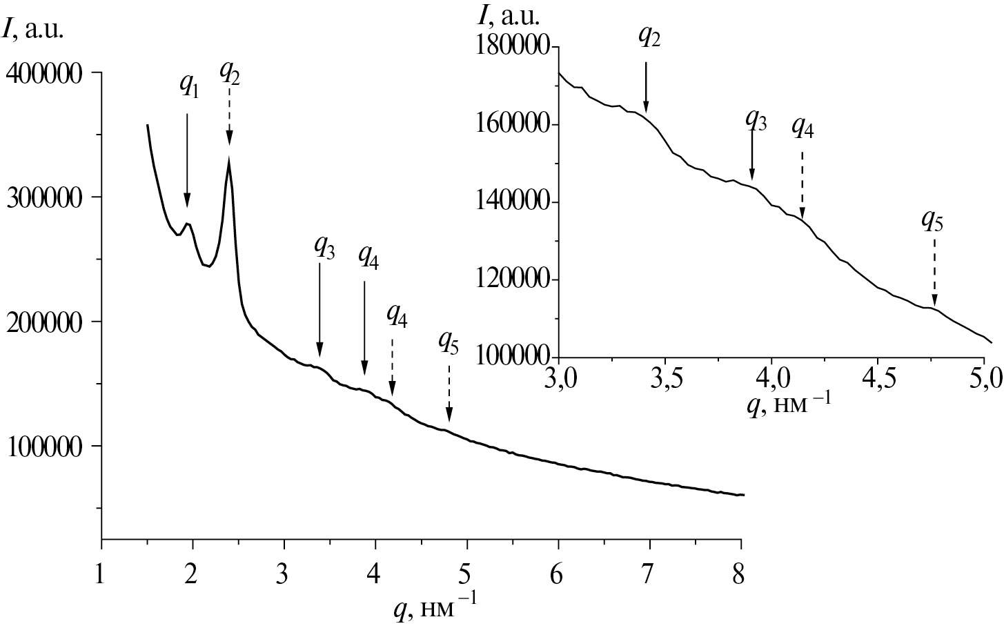 Так, авторы работы [19] предлагают осуществить интерполиэлектролитную реакцию на межфазной границе хлороформ‒вода. Гребнеобразный полиэлектролит pAUTA с противоионом толуолсульфонат при этом был растворен в воде (хлороформ для него является плохим растворителем). Aнионный полиэлектролит pAMPS (в составе полиэлектролит-коллоидного комплекса с додециламином) был растворен в хлороформе (для этого полимера вода служила плохим растворителем). Интенсивное перемешивание такой смеси приводило к моментальному формированию стехиометрического осадка ИПЭК. В растворе оставалась низкомолекулярная соль – толуолсульфонат додециламмония в стехиометрическом составе. Полученный в межфазных условиях ИПЭК имел кубическую упаковку согласно данным малоуглового рентгеновского рассеяния q1 : q2 : q3 : q4 : q5 = = 1 : (4/3)0.5 : (8/3)0.5 : (11/3)0.5 : (12/3)0.5 : (16/3)0.5 [21] (рис. 2). Очевидно, что на межфазной границе вода‒хлороформ, где, видимо, и происходила интерполиэлектролитная реакция, были созданы термодинамически плохие условия для каждого из полимеров, и гексагональная ориентация гребнеобразного полиэлектролита разрушалась.