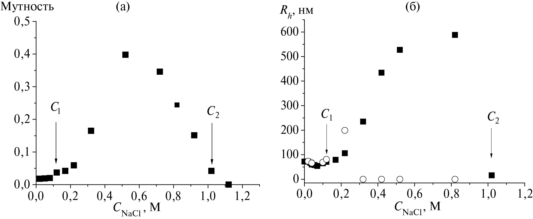 - Конечная область. СNaCl > C2 – фазовое разделение с образованием осадка отсутствует, в растворе наличие частиц с гидродинамическим радиусом 15 нм. Значения критической концентрации С1 и С2 для дисперсий ИПЭК, полученных на основе pAMPS (Mw = 702 × 103), равны 0.12 и 1.0 моль/л соответственно.
