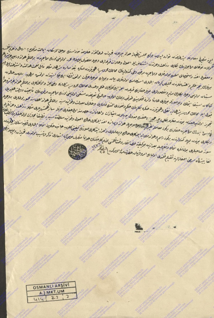 Для получения ответа упомянутый мною господин Хаджы Исмаил Эфенди и его соратники Ахмед, Юсуф и Мехмед Гази, Хаджы Абдулваххаб отправились в Стамбул, и представили [письмо], так как обе стороны должны были выразить свои мнения, дать разрешение на наше предложение. В любом случае издание указа находится в вашей власти. Я – губернатор Аданы, 27 Зуль-када 76».