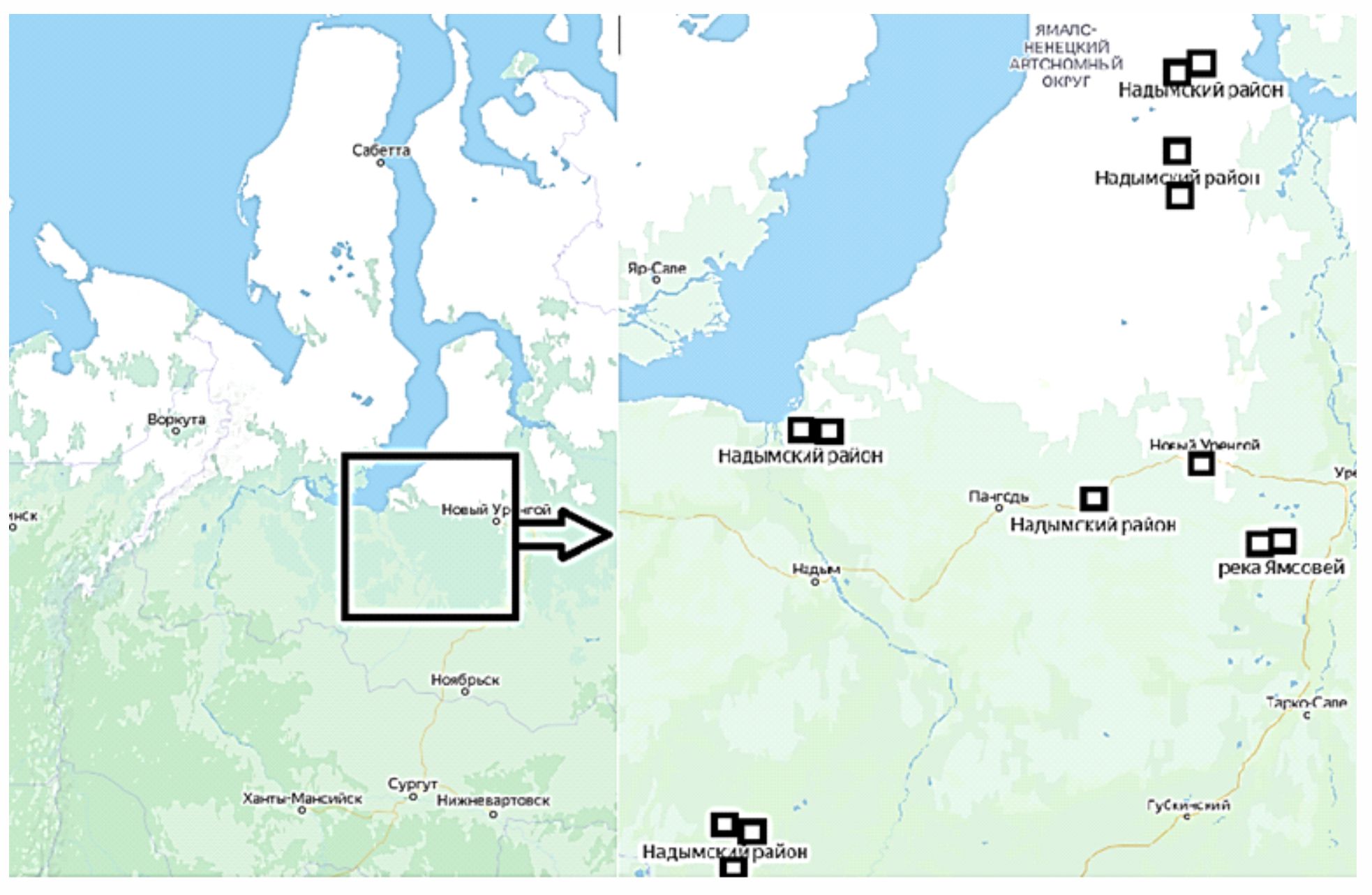 Актуальность проблемы современной природной и антропогенной динамики состава почв севера Западной Сибири и определила повышенный интерес исследователей к этой теме. Выявлены основные закономерности геохимии почв, определены валовые содержания основных тяжелых металлов и металлоидов [17-19]. Обозначено, что особый характер геохимических потоков вещества в ландшафтах Надымского района складывается из-за высокой литолого-геоморфологической неоднородности территории в сочетании с суровыми климатическими условиями [20]. Типологическое разнообразие почв Надымского района, обусловленное его значительной площадью и расположением в разных природных зонах, литологическая неоднородность почвообразующих пород, современная климатогенная динамика и разнообразие форм техногенного воздействия определяют необходимость дальнейшего исследования биогеохимических особенностей почв. Знание биогеохимических особенностей региона необходимо для разработки программ рекультивации нарушенных участков, расчете показателей геоэкологического риска и определения приемов управления этим риском [21]. Цель данного исследования – выявить биогеохимические особенности почв и доминантов растительного покрова Надымского района ЯНАО.