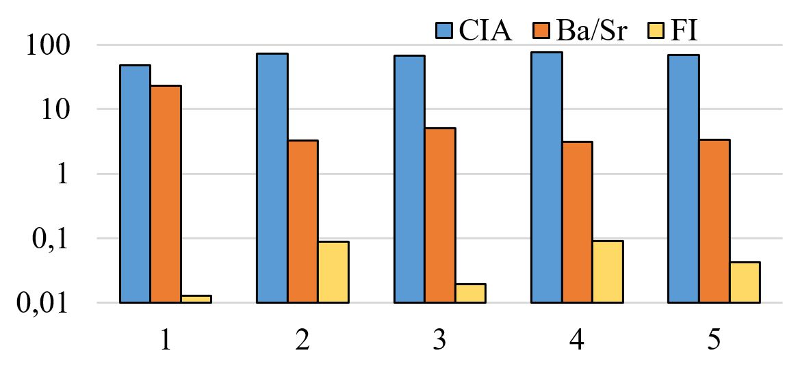 Индекс химического изменения CIA=100×Al2O3/(Al2O3+CaO+Na2O+K2O). Данный индекс характеризует процесс выщелачивания и показывает соотношение первичных и вторичных минералов [33]. Индекс используют как показатель климатических условий формирования почв [34].
