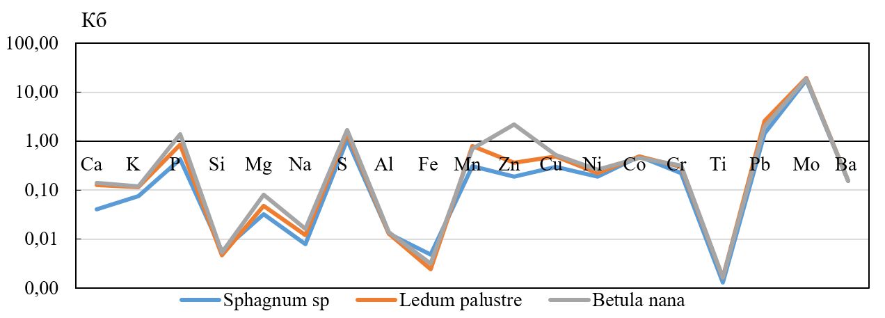 Наиболее активным накоплением большинства элементов отличается карликовая березка (Betula nana L.), в которой отмечено максимальное содержание Ca, K, P, Mg, Zn, Ni. Интенсивное накопление элементов кустарниками (карликовой березкой и ивой) было ранее отмечено для тундр Ямала [49; 50]. Рассчитанный коэффициент биологического накопления Кб (рис. 4) показал, что к элементам энергичного и сильного накопления (Кб=n-100n) относятся свинец, молибден, кадмий, хлор, сера, что в целом соответствует рядам биологического поглощения по А.И. Перельману. У карликовой березы помимо вышеперечисленных элементов к элементам накопления относятся фосфор и цинк. Остальные элементы являются элементами захвата. По содержанию элементов слабого и очень слабого захвата, к которым относятся Co, Cr, Ti, Al [41], исследуемые растения различаются незначительно. Сфагновые мхи отличаются слабым накоплением катионогенных щелочных и щелочноземельные элементы, мигрирующие в основном в виде простых катионов (Na+, K+, Ca2+, Mg2+).