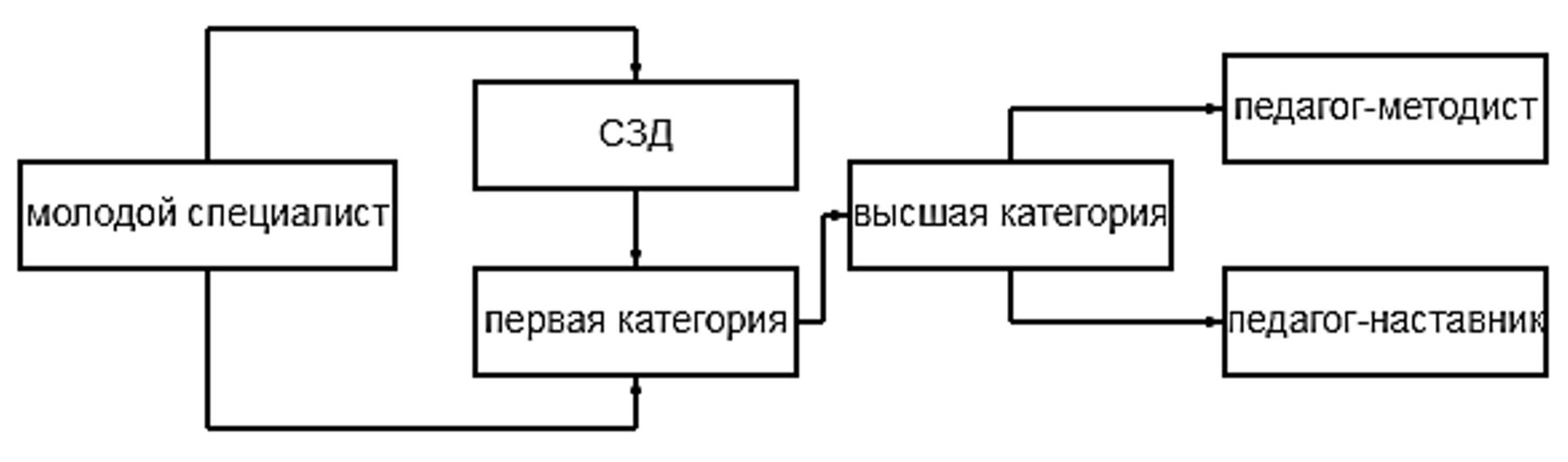 Профессиональные траектории педагога-бакалавра и педагога-магистра в рамках педагогической деятельности учителем в школе или преподавателем в СПО идентичны и предполагают последовательную модель профессионального роста (рис. 1) лишь в педагогическом и методическом аспектах.