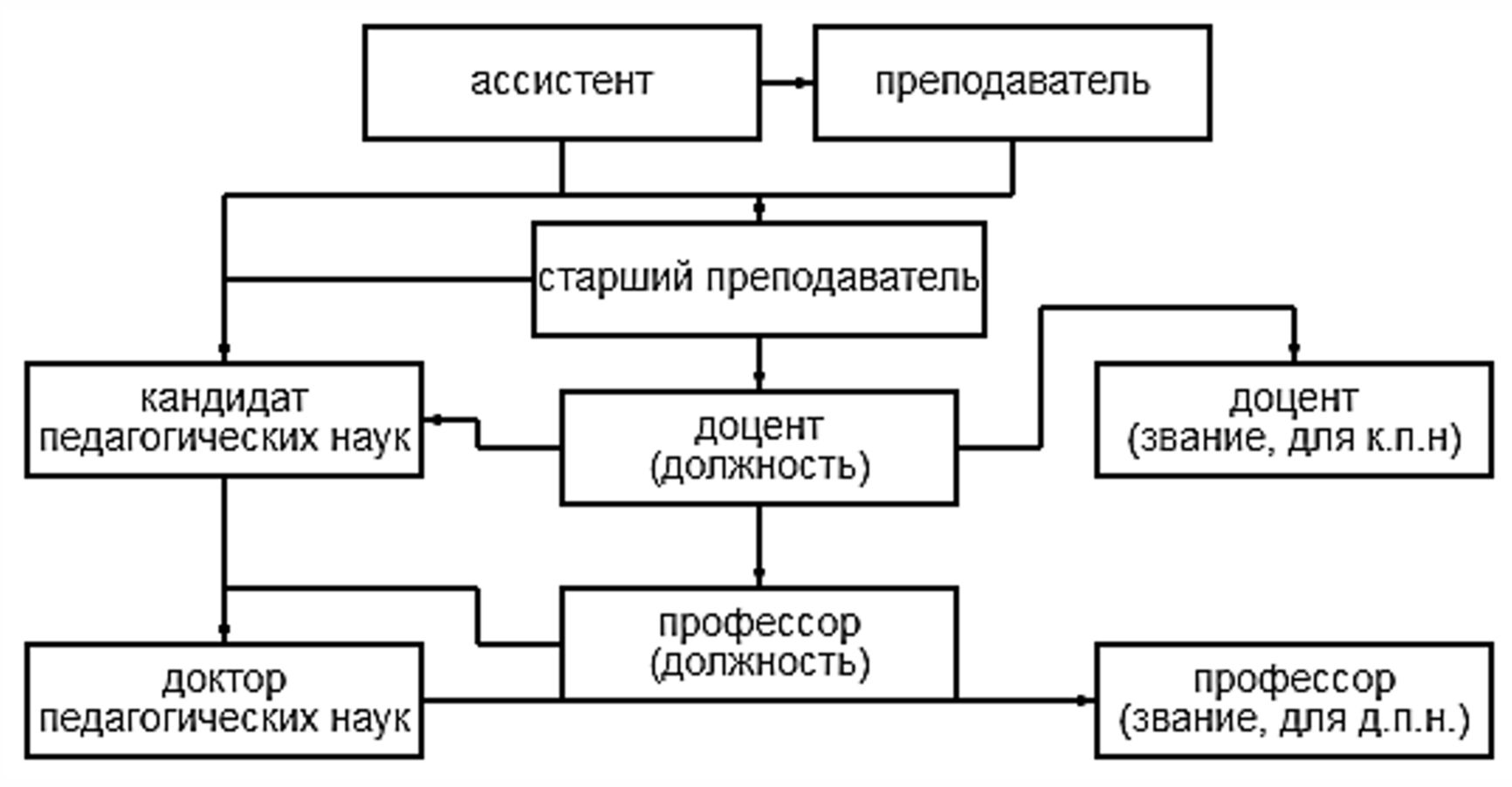 Квалификация преподавателя высшей школы предполагает научно-педагогическую деятельность на всех уровнях ППС: научная квалификация подтверждается учёной степенью кандидата и доктора наук по определённой научной специальности, а педагогическая – педагогическим званием доцента и профессора по специальности и получение звания возможно только после получения учёной степени; за особые заслуги в науке и высшей школе возможно присвоение почётного звания «Заслуженный деятель науки Российской Федерации», а за выдающиеся – «народный учитель».