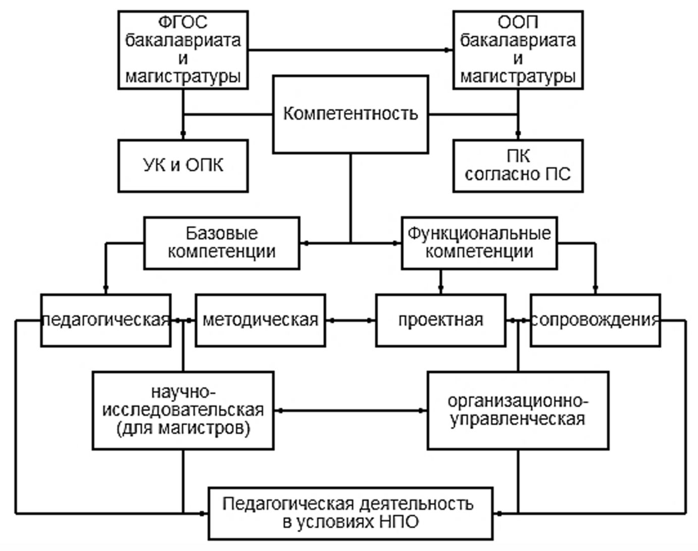 Основу описания структуры педагогических квалификаций и профессиональной компетентности, а также определения возможной профессиональной траектории составили анализ предшествующих исследований по рассматриеваемой теме и нормативных положений организации высшего педагогического образования по программам бакалавриата и магистратуры «Педагогическое образование»: госстандарта (ФГОС по направлениям 44.03.01, 44.03.05 и 44.04.01) в части формирования универсальных (УК) и общепрофессиональных (ОПК) компетенций [19-21] и общей системы обучения, уровней профессиональной квалификации (УПК) [18] и профстандарта педагога (ПС) [12] в части формируемых профессиональных компетенций (ПК) в системе формирования профессиональной компетентности.