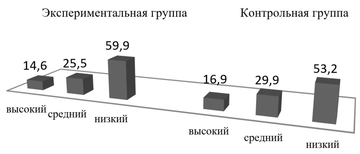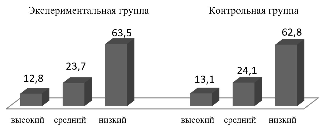 На диаграмме 1 представлены уровни сформированности иноязычных умений у студентов после выполнения творческих заданий. Он был не высокий (63,5% в экспериментальной и 62,8% – контрольной группе).