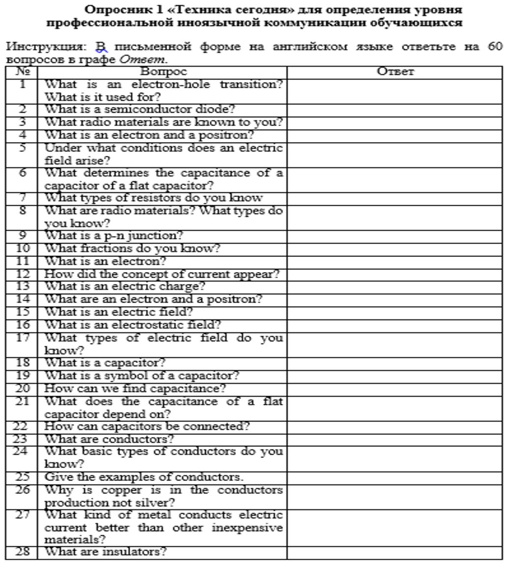 В рамках констатирующего этапа проведен опрос для определения уровня иноязычной коммуникации по электротехнике (см. рис. 2 и 3), целью которого было выявление уровней сформированности профессиональной иноязычной коммуникации студентов.