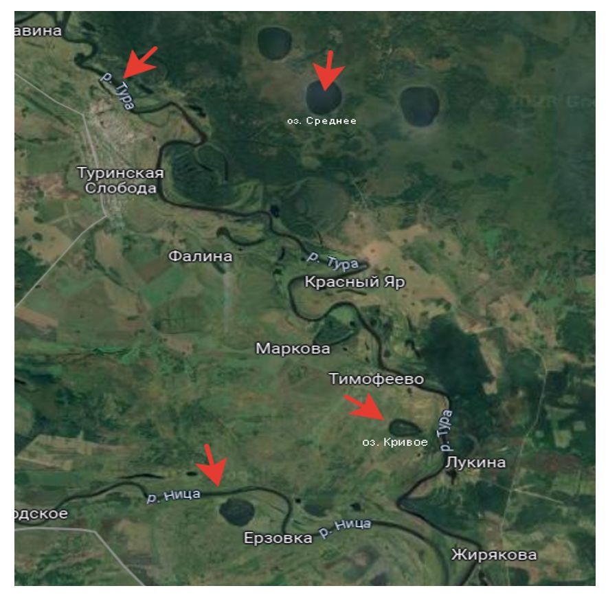 р. Туры), озеро Кривое (старица р. Тура, периодически сообщающаяся с ней), озеро Среднее (обособленное, более 70 лет не соединенного с р. Тура). Географические координаты мест сбора ихтиологического материала, следующие: р. Тура – 57º65ʹ82.1ʺN, 64º36ʹ06.9."E;
