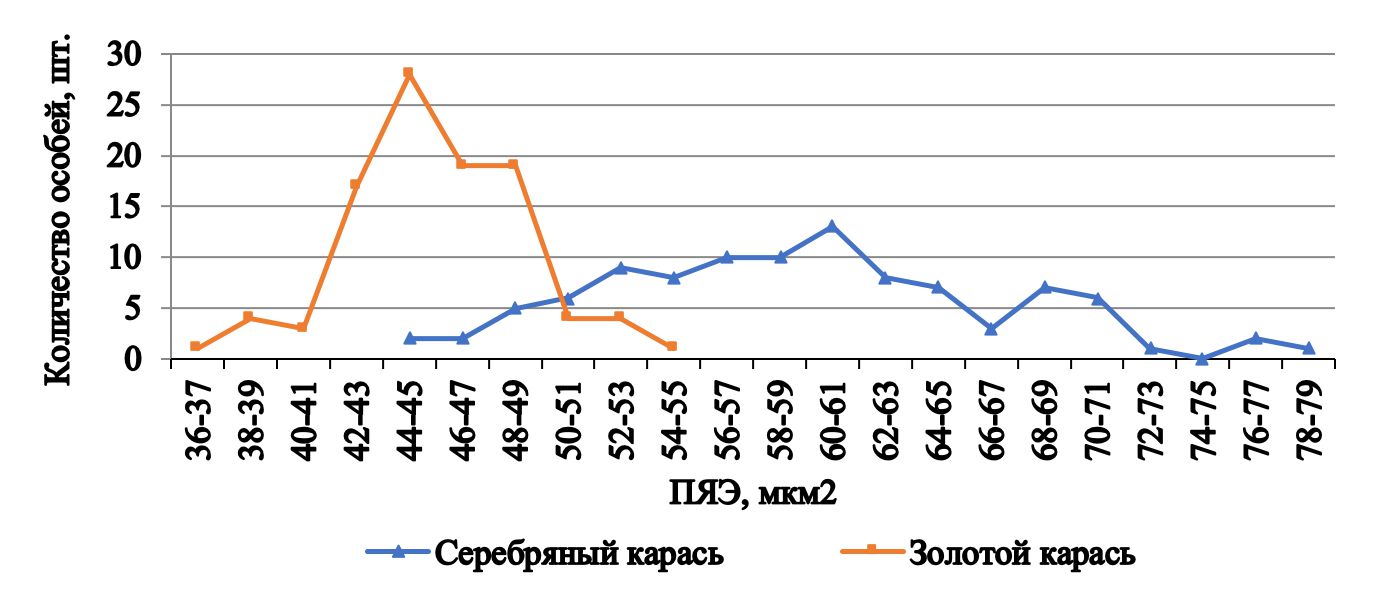 При цитологическом исследовании в популяции серебряного карася оз. Среднее выявлены диплоиды (62 особи) и триплоиды (20 особей), ПЯЭ которых варьировали у диплоидов в диапазоне от 44,60 до 62,85 мкм2, а у триплоидов – от 63,24 до 79,75 мкм2.