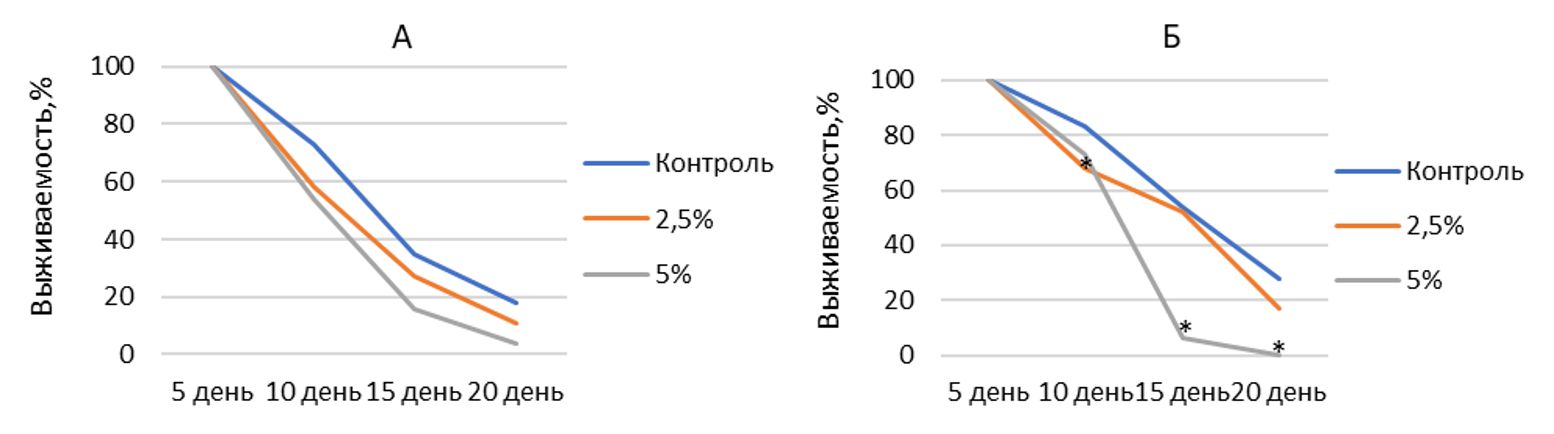 Анализ выживаемости и плодовитости проводили по стандартной методике [13; 18].