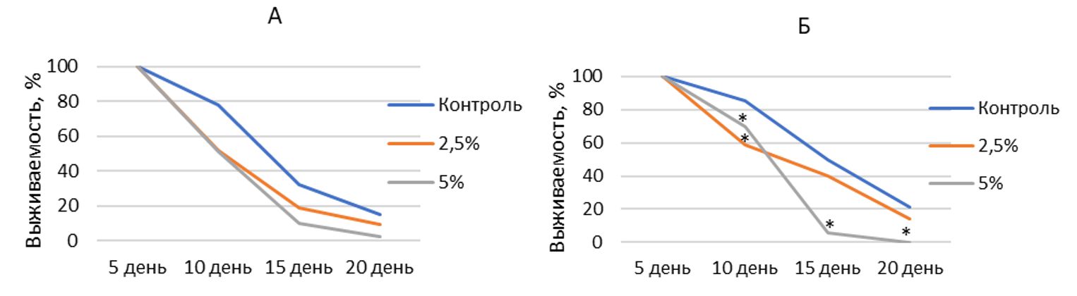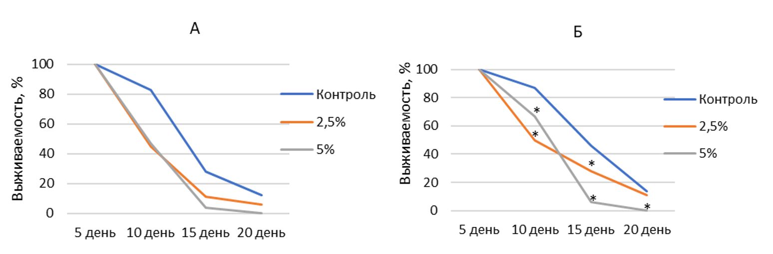 Рис. 3. Выживаемость дрозофил нефтеустойчивых линий в зависимости от условий содержания: А – при содержании в нефтезагрязнённой среде; Б – при содержании на чистой питательной среде.