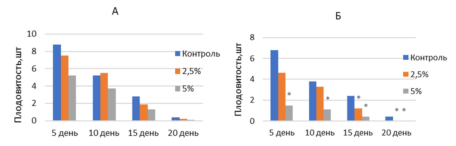 Рис. 4. Плодовитость дрозофил в зависимости от условий содержания: А – при содержании в нефтезагрязнённой среде; Б – при содержании на чистой питательной среде.