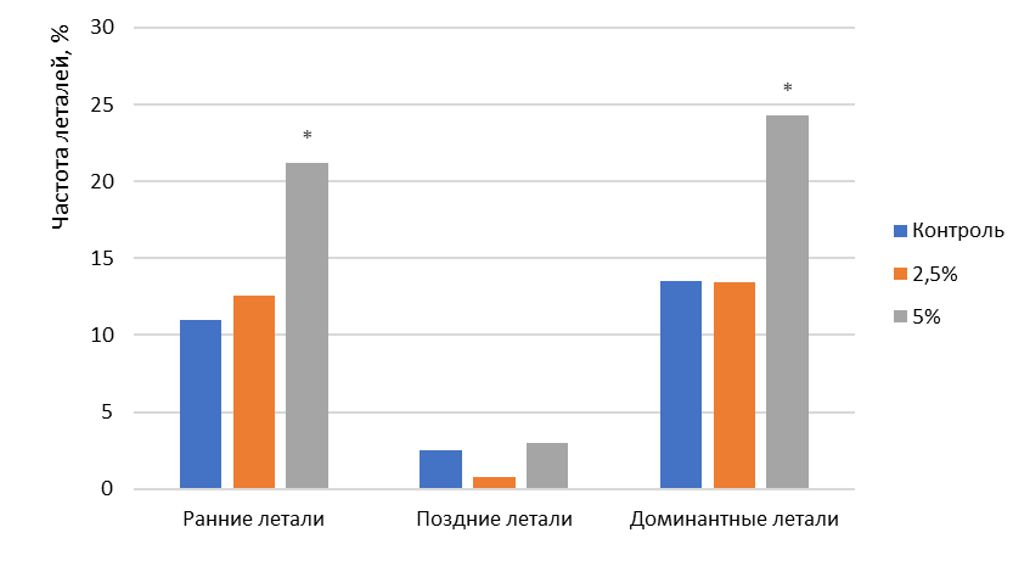 Общее количество доминантных леталей (рис. 5) зависит от количества ранних и поздних леталей и отражает их общую частоту. У мух, адаптированных к 2,5% и 5%, частота доминантных леталей значительно превышает контрольные показатели (р < 0,05). На данный момент влияние нефти на живые организмы недостаточно изучено, но опираясь на имеющуюся литературу, можно прогнозировать возможные летальные исходы животных от токсического действия [20].