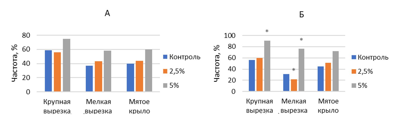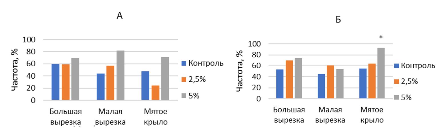 Анализ морфозов крыльев самок мух в нефтезагрязнённой среде не отличается от контроля. Анализ морфозов самок мух, при содержании в условиях чистой питательной среды выявил, что особи, адаптированные к 2,5% нефти в среде, содержат, на хотя бы одном крыле, вырезку мелкого размера (рис. 6) с меньшей частотой (р < 0,05), чем остальные, а прочие морфозы сохраняется на уровне контроля. При содержании на чистой питательной среде мух, адаптированных к 5% нефти в среде, крупная вырезка резко увеличивается (р < 0,05).