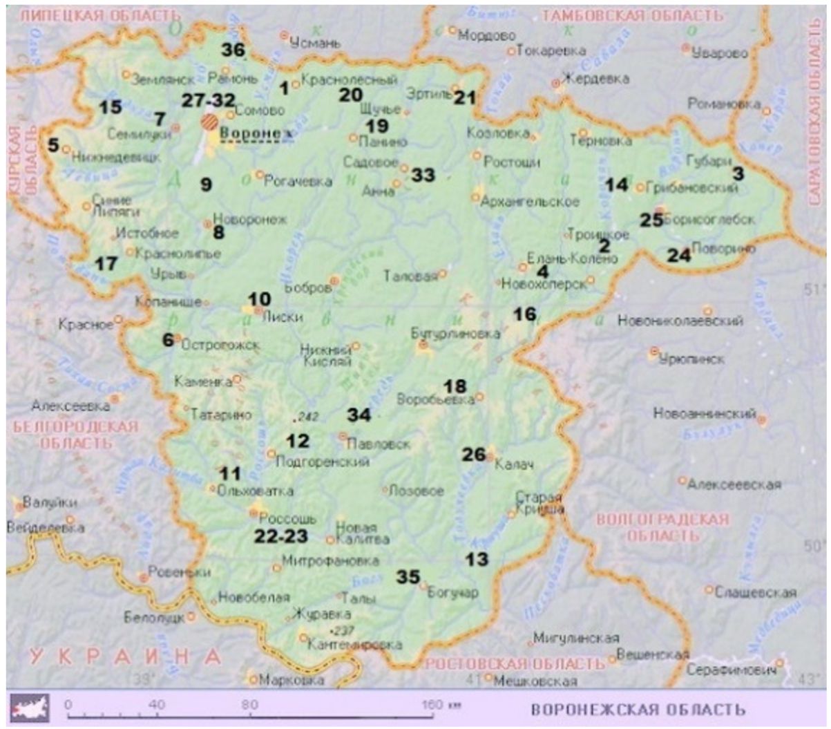 Материалы и методы исследования. Для исследования использовали разные по характеру антропогенного воздействия территории Воронежской области: промышленные предприятия (рис. 1: 23, 24, 28); теплоэлектроцентраль (рис. 1: 27); атомная электростанция (АЭС) (рис. 1: 8); аэропорт (рис. 1: 30); улица г. Воронежа (рис. 1: 31); высоковольтные линии электропередач (рис. 1: 9); водохранилище (рис. 1: 29); городские населенные пункты (рис. 1: 25, 26); медно-никелевое месторождения (рис. 1: 4); зоны загрязнения после аварии на Чернобыльской АЭС (рис. 1: 5-7); районы активного растениеводства (рис. 1: 10-22); дороги разной степени загруженности: трасса М4 (рис. 1: 32, 34), трасса А144 (рис. 1: 33), проселочная (рис. 1: 35) и железная дороги (рис. 1: 36); зоны контроля: Воронежский биосферный заповедник (рис. 1: 1), Хоперский заповедник (рис. 1: 2), Теллермановский лес (рис. 1: 3).