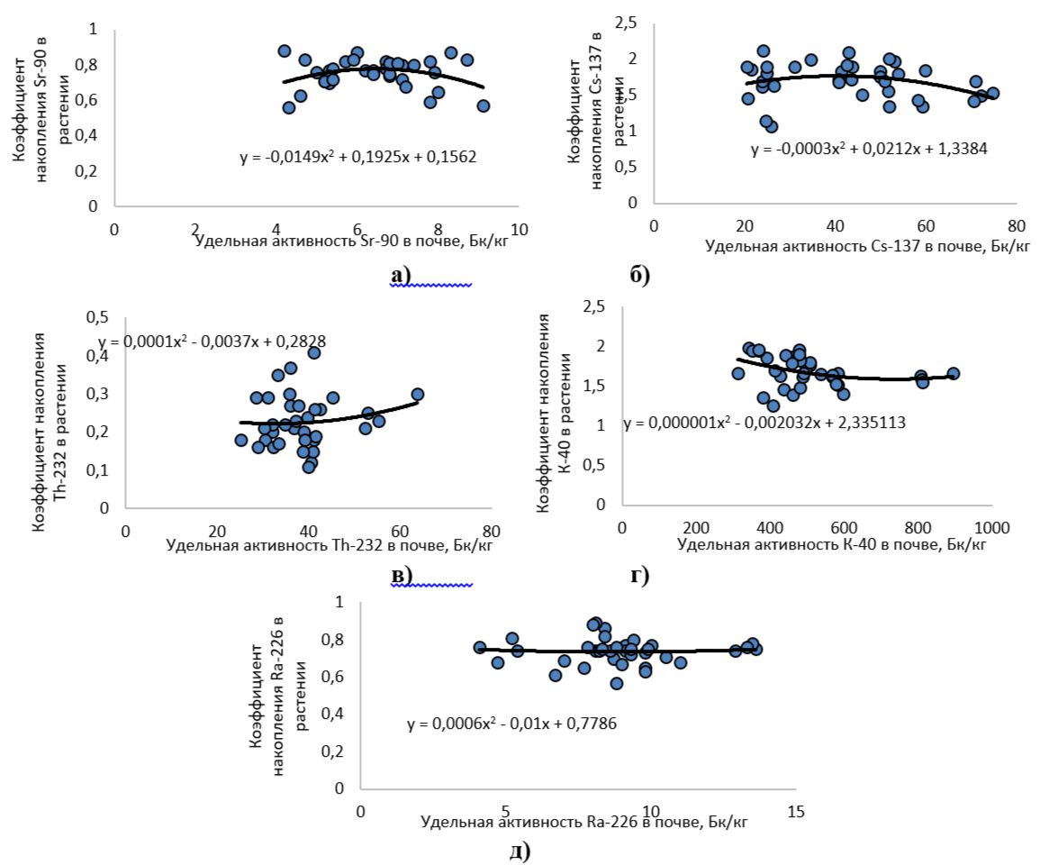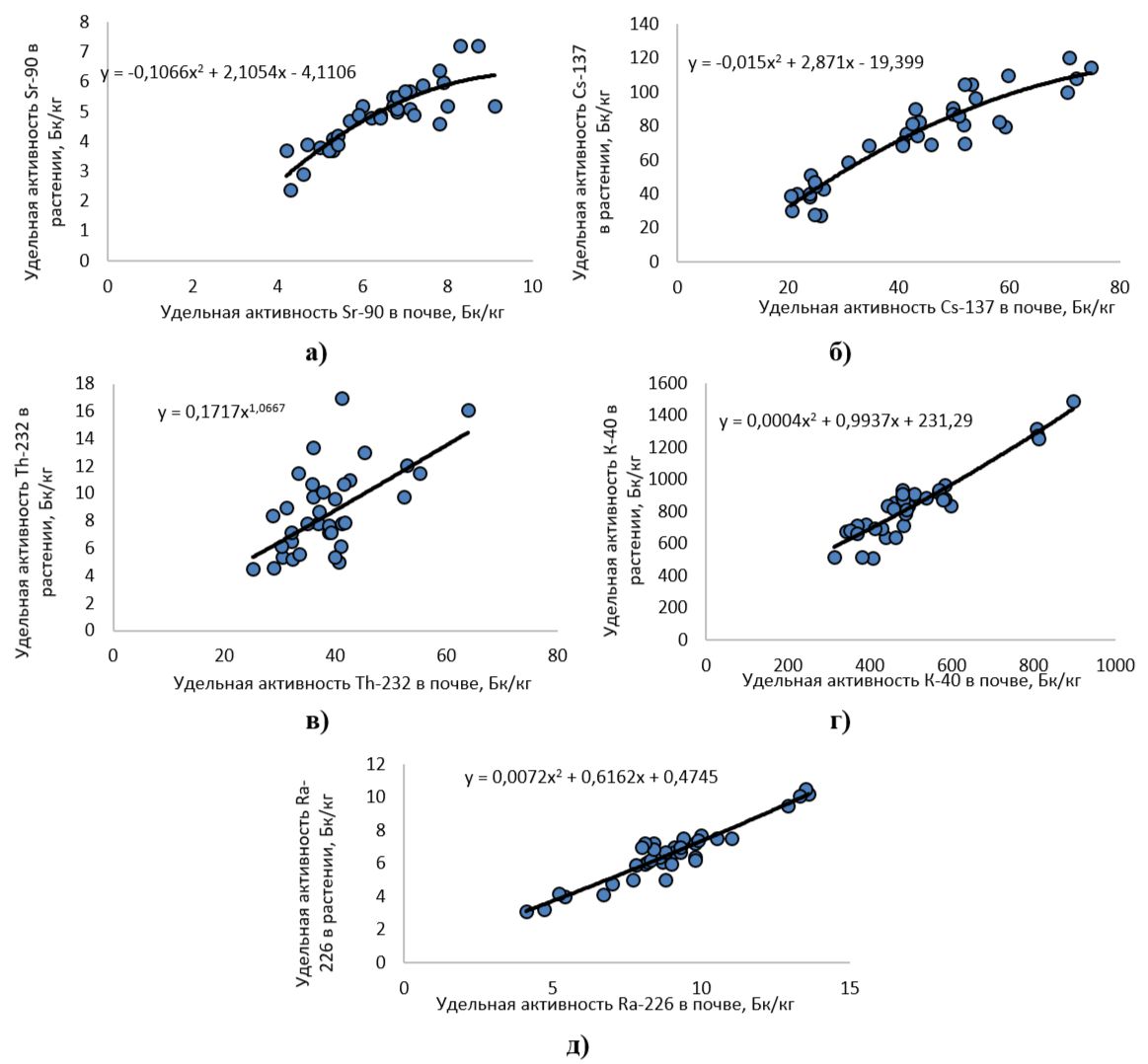 Рис. 2. Зависимость удельной активности радиоизотопов в надземной части полыни горькой от удельной активности их в почве (а - Sr-90, б - Cs-137, в - Th-232, г - К-40, д – Ra-226)