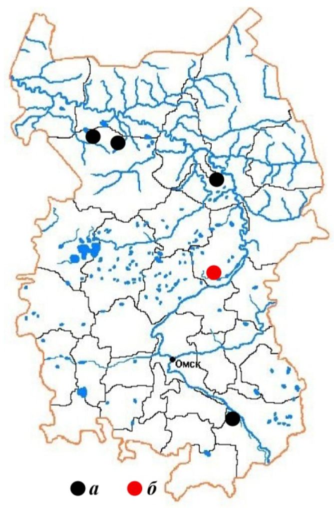 Рис. 1. Местонахождения Potamogeton praelongus в Омской области: а – известные [9], б – новое