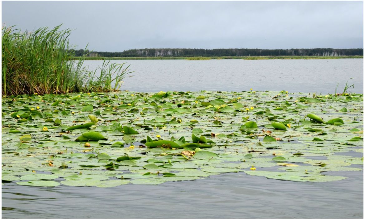 Рис. 4. Фрагмент фитоценоза Nuphar lutea по краю сплавины в оз. Бугалы. 13.08.2023 г.