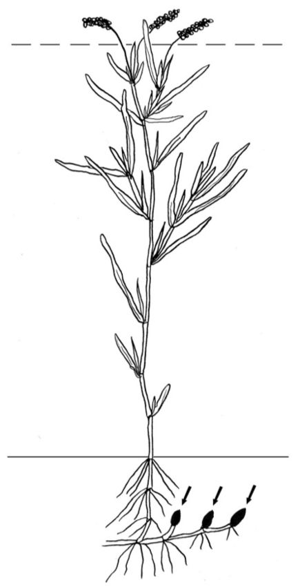 Рис. 5. Схема биоморфы Potamogeton praelongus. Стрелками указаны зимующие почки. Сплошная горизонтальная линия указывает уровень донного грунта, пунктирная – уровень воды