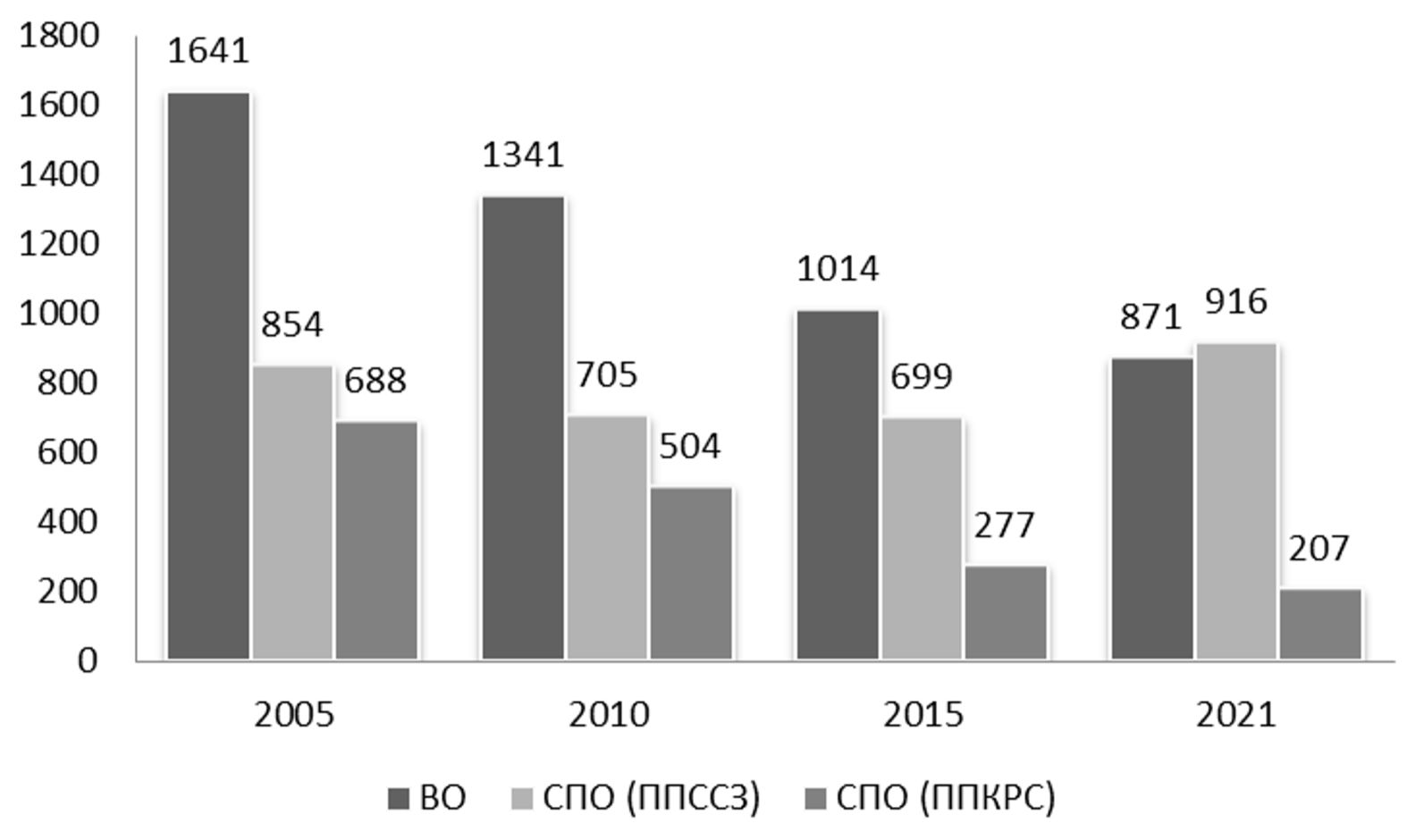 Можно было бы в качестве контраргумента привести причины недостаточности материально-технической базы в периферийных регионах для качественной подготовки по данным специальностям или сокращение количества поступающих как последствие демографической ямы 90-х гг. Последний фактор привел к сокращению доли молодежи (18–24 лет) с 2010 по 2020 г. на 40% – c 16172 тыс. чел. до 9617 тыс. чел. (https://clck.ru/3DAFhA). К этому добавляется переориентация интереса поступающих на профессии, которые могут дать основу для ведения собственного бизнеса, и мы получаем объяснение, почему за последнее десятилетие выпуск по программам ППКРС уменьшился на 72,4% – 572,1 тыс. чел. в 2010 г. и 158,1 тыс. чел. в 2021 г. (https://clck.ru/3DAFn4) (рис. 3).