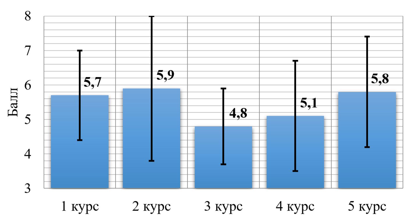Самый высокий уровень профессиональной адаптированности отмечен у обучающихся 2 курса (5,9±2,1), однако достоверных различий по отношению с результатами на 1 (5,7±1,3) и 5 (5,8±1,6) курсах не установлено. Нет достоверных различий и между другими данными - исследования обучающихся 3 курса (4,8±1,1) и 4 курса (5,1±1,6). Но при попарном сравнении результатов экспресс-диагностики обнаружено, что на 3 и 4 курсе уровень профессиональной адаптированности достоверно ниже (p < 0,05) по сравнению с уровнем на 1, 2 и 5 курсах. Здесь возможно провести корреляционную связь с результатами описанного выше анкетирования, линия тренда в обоих случаях очень схожа. Точно также заметна параболическая закономерность – от высоких значений у 1 курса, «провисание» к середине обучения в образовательной организации и снова подъем графика адаптированности на выпускном курсе. Это характеризуется следующим образом. Курсанты 1 курса находятся в рамках социально-бытовой адаптации, когда самостоятельная профессиональная деятельность еще «далеко», а особый уклад жизни в образовательной организации МВД России «близко» и требует максимальной концентрации для своего принятия. На 2 курсе период социально-бытовой адаптации пройден, обучающиеся приобрели первые профессиональные компетенции, они искренне устремлены к освоению новых. У курсантов 3 курса, как отмечалось ранее, проявляется «усталость», прежде всего от процесса обучения и высоких требований соблюдения дисциплины, наступает состояние равнодушия, которое затрагивает и сферу профессиональной адаптации. На 4 курсе в преддверии производственной практики в территориальных органах и организациях МВД России курсанты вновь актуализируют профессионализирующие механизмы, равно включается упомянутый выше мотивационный компонент. Для обучающихся 5 курса приходит время рефлексии пройденного первоначального этапа профессионализации в образовательной организации МВД России и переход в новое социальное состояние практического сотрудника органов внутренних дел.