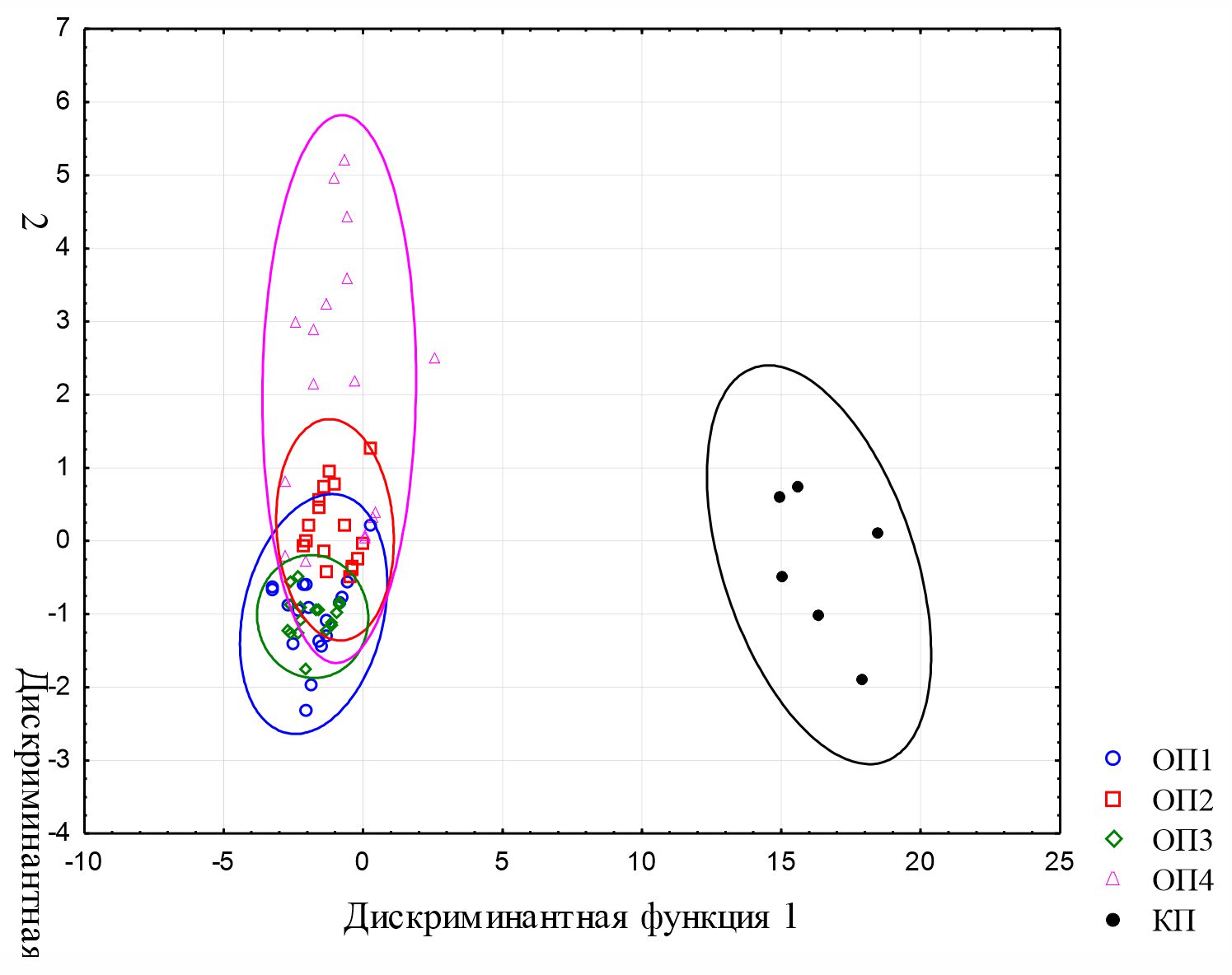 Дискриминантный анализ, проведённый с использованием таких биохимических параметров хвои, как уровень ПОЛ, содержание общего азота и фосфора, а также общих фенольных соединений, флавоноидов и пролина, отделил КП от ОП1–ОП4 по дискриминантным функциям 1 и 2 (рис. 1). Корректность отнесения в группы составляла: КП–100 %, ОП1–67 %, ОП2–78 %, ОП3–100 %, ОП4–58%.