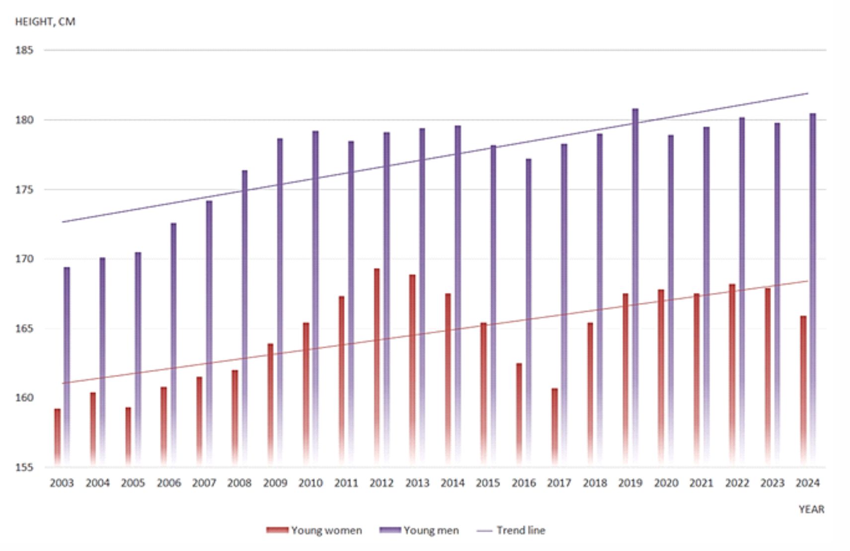 Belarusian scientists S.A. Sidorovich and Zh.A. Shavel also identified long-term dynamics in the increase in average height, comparing the indicators of young people aged 17–25 years living in the Grodno region with data for 1978 [17].