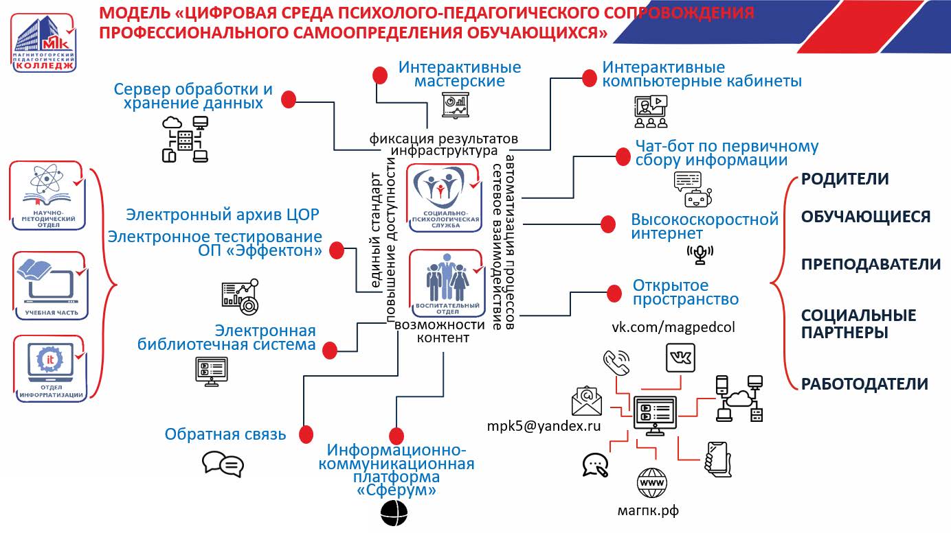 • Разработанная цифровая среда обеспечивает реализацию открытого коммуникативного пространства для обучающихся, родителей, преподавателей, социальных партнеров и работодателей, что способствует организации и реализации целенаправленной работы по профессиональному самоопределению обучающихся на базе Магнитогорского педагогического колледжа.