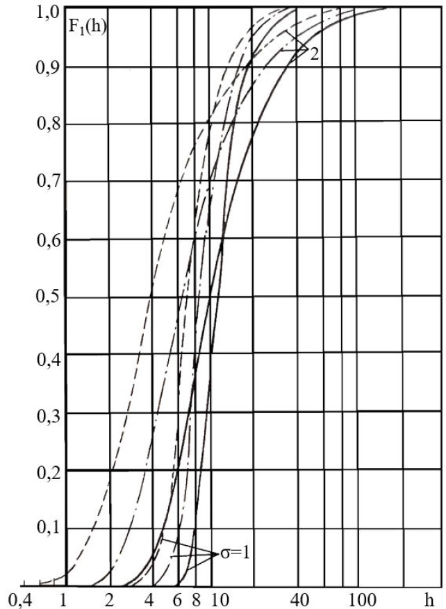 Рисунок 2 – Интегральная функция распределения абсолютных максимумов огибающей порывов ветра: сплошные кривые – μ (Т)=200; штрих-пунктир – μ (Т)=100; пунктир – μ (Т)=50