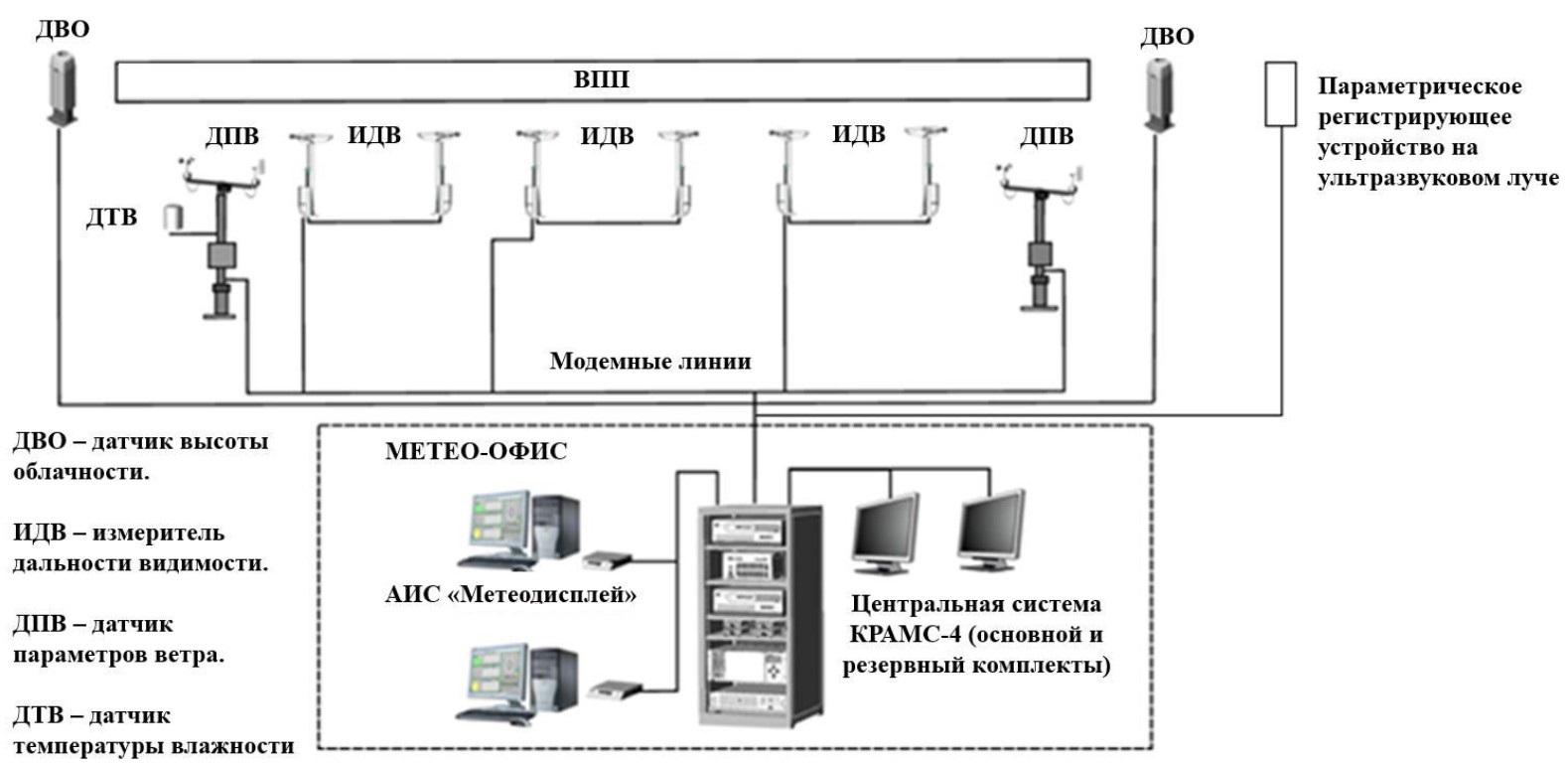 Центральная система, входящая в состав КРАМС, состоит из комплекта технических средств, специального программного обеспечения и измерительных преобразователей метеовеличин (датчиков) [Институт радарной…, б.г.]. Данные от датчиков поступают каждые 15 секунд, обрабатываются, анализируются и передаются диспетчерам аэропорта.