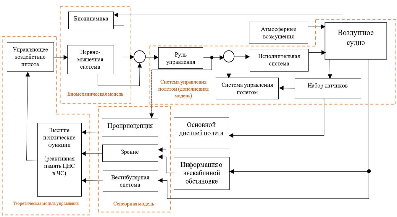 В ситуациях, требующих немедленное выполнение определенных процедур, идет упрощение цели. Здесь управляющие действия уже во многом зависят от опыта и навыков пилота, именно поэтому на данном этапе большую роль играет обучение пилота. Знания, навыки и опыт пилота помогают определить необходимые сигналы и усилия для того, чтобы установить контроль с обратной связью. Нервно-мышечная система осуществляет управляющее воздействие на руль управления. Сигналы от руля управления, в свою очередь, используются в качестве требований к параметрам динамики полета, таким как угол тангажа или нормальное ускорение. Эти требования удовлетворяются при помощи системы управления самолета, которая обеспечивает соответствующее движение управляющих поверхностей или изменение режимов работы двигателя. Таким образом, изменения положения крыла или хвостового оперения, или значения тяги двигателя создают силы и моменты, которые меняют положение самолета относительно встречного воздушного потока. Пилот получает информацию о новом положении самолета в основном посредством визуальной сенсорной системы, которая доставляет информацию о внекабинной обстановке в мозг [Erokhin et al., 2021]. Пилот также воспринимает сигнал руля управления через проприоцептивное чувство. Эти сигналы эффективно замыкают контуры управления с обратной связью. Однако положение пилота в самолете также означает, что его тело подвержено результирующим ускорениям, возникающим либо из-за его команд, либо из-за атмосферных возмущений. Поэтому на нервно-мышечные силы, действующие на руль управления, влияет возмущение, возникающее, когда ускорения самолета проходят через биодинамическую систему пилота, то есть ключевые компоненты модели пилота могут быть сгруппированы как теоретические и сенсорные модели управления.